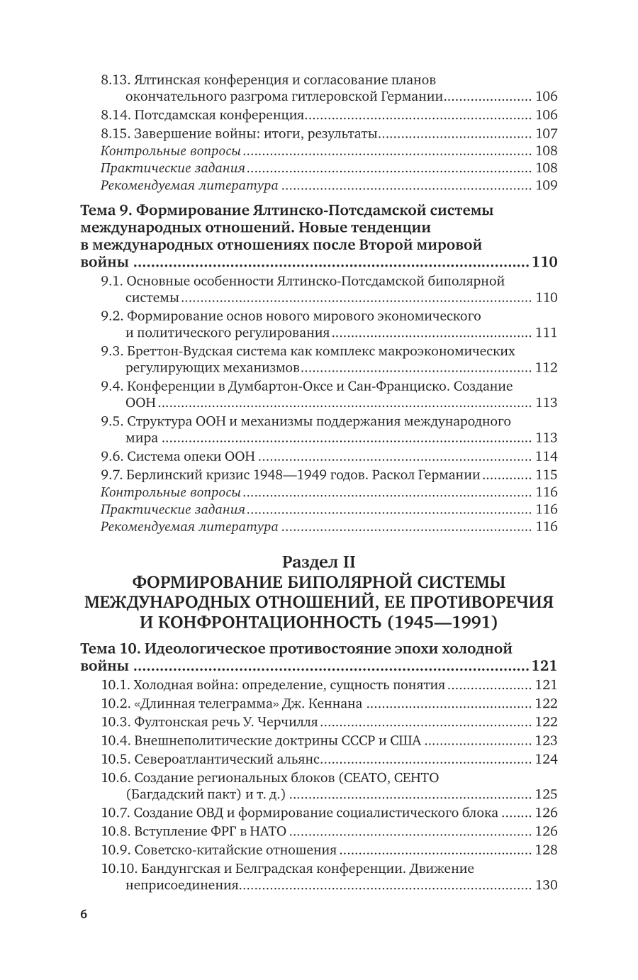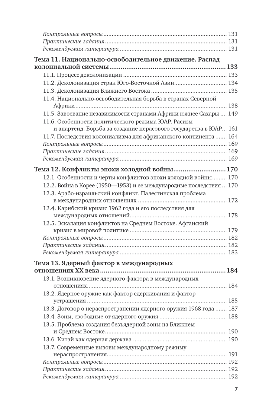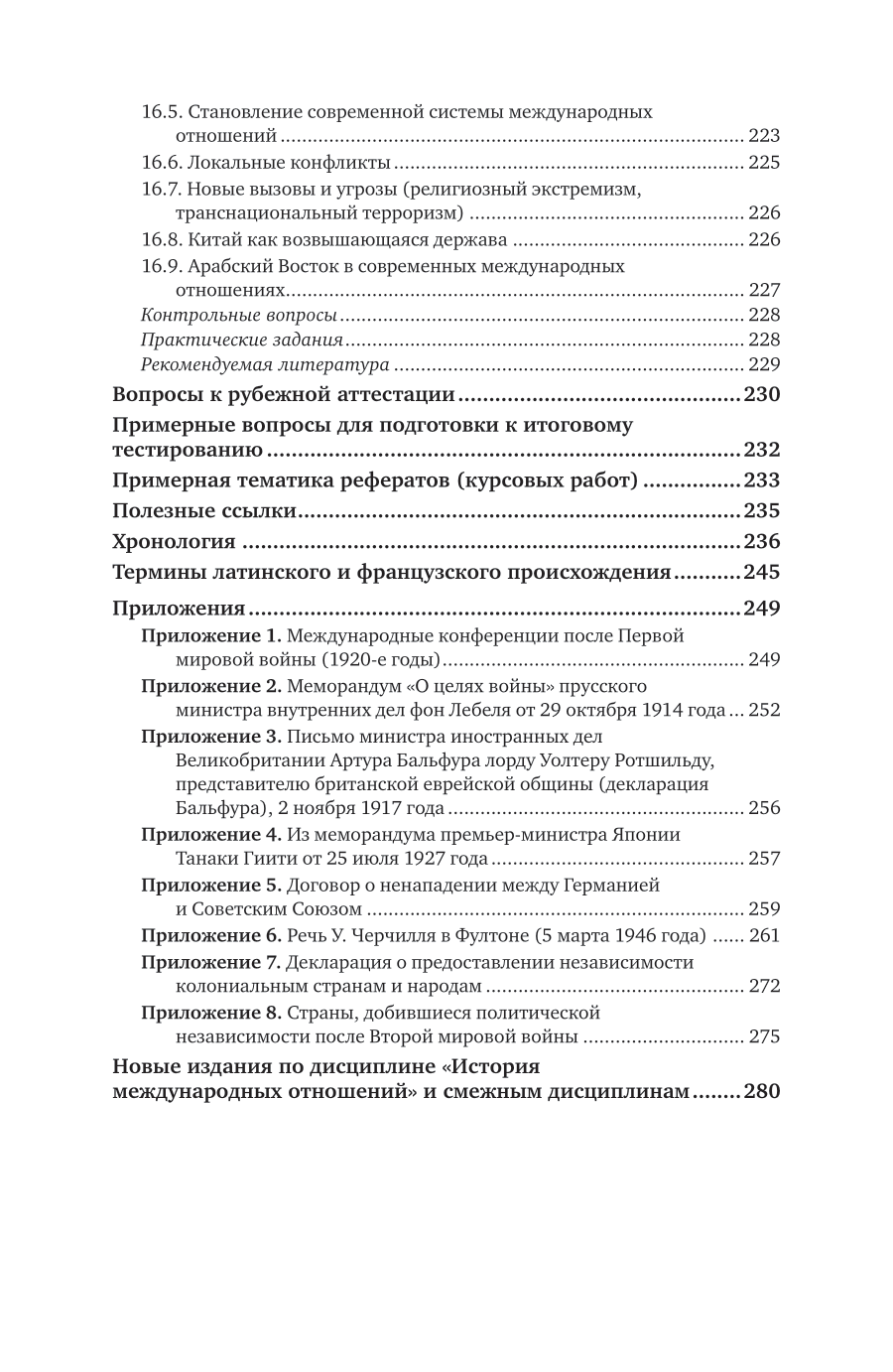 Курс построен таким образом, что в разделе I студенты знакомятся с основными понятиями международных отношений как научной дисциплины, получают представление о периодизации международных отношений, рассматривают ключевые события истории международных отношений XVI-XIX вв. и начала XX в. В разделе II примененный авторами историко-проблемный принцип позволил выявить причинно-следственные связи между событиями истории международных отношений, в частности XX в., и современными международными отношениями, доказать, что предпосылки нынешних проблем мировой политики уходят своими корнями в предшествующую эпоху. Таким образом, у студентов формируется глобальное видение международных отношений как логичной системы, которая функционирует в рамках определенных законов. В разделе III рассматривается становление современного миропорядка начиная с 1990-х гг. После каждой главы размещены практические задания, что позволяет закрепить приобретенные в ходе лекций и семинаров знания, обратить внимание студентов на самые важные проблемы в рамках пройденного материала. Соответствует актуальным требованиям федерального государственного образовательного стандарта высшего образования. Для студентов, обучающихся по направлениям подготовки «Международные отношения» и «Зарубежное регионоведение», а также для всех, кто интересуется международными отношениями.