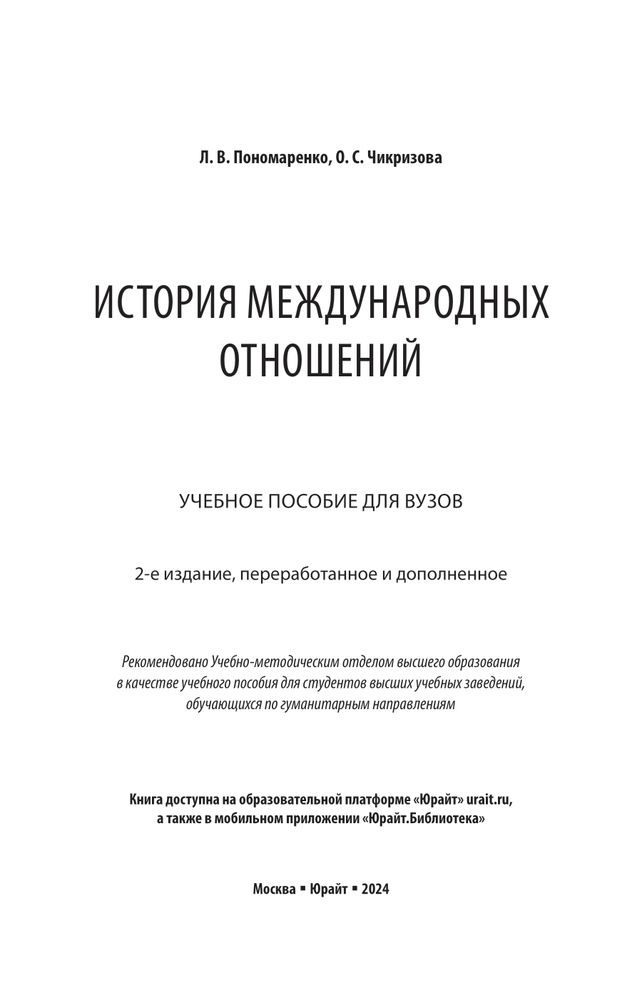 История международных отношений 2-е изд. пер. и доп. Учебное пособие для вузов (Людмила Васильевна Пономаренко); ЮРАЙТ, 2024