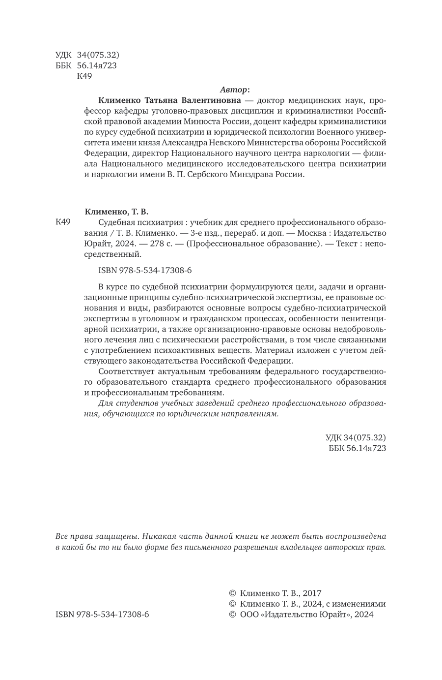 Судебная психиатрия 3-е изд. пер. и доп. Учебник для СПО (Татьяна Валентиновна Клименко); ЮРАЙТ, 2024