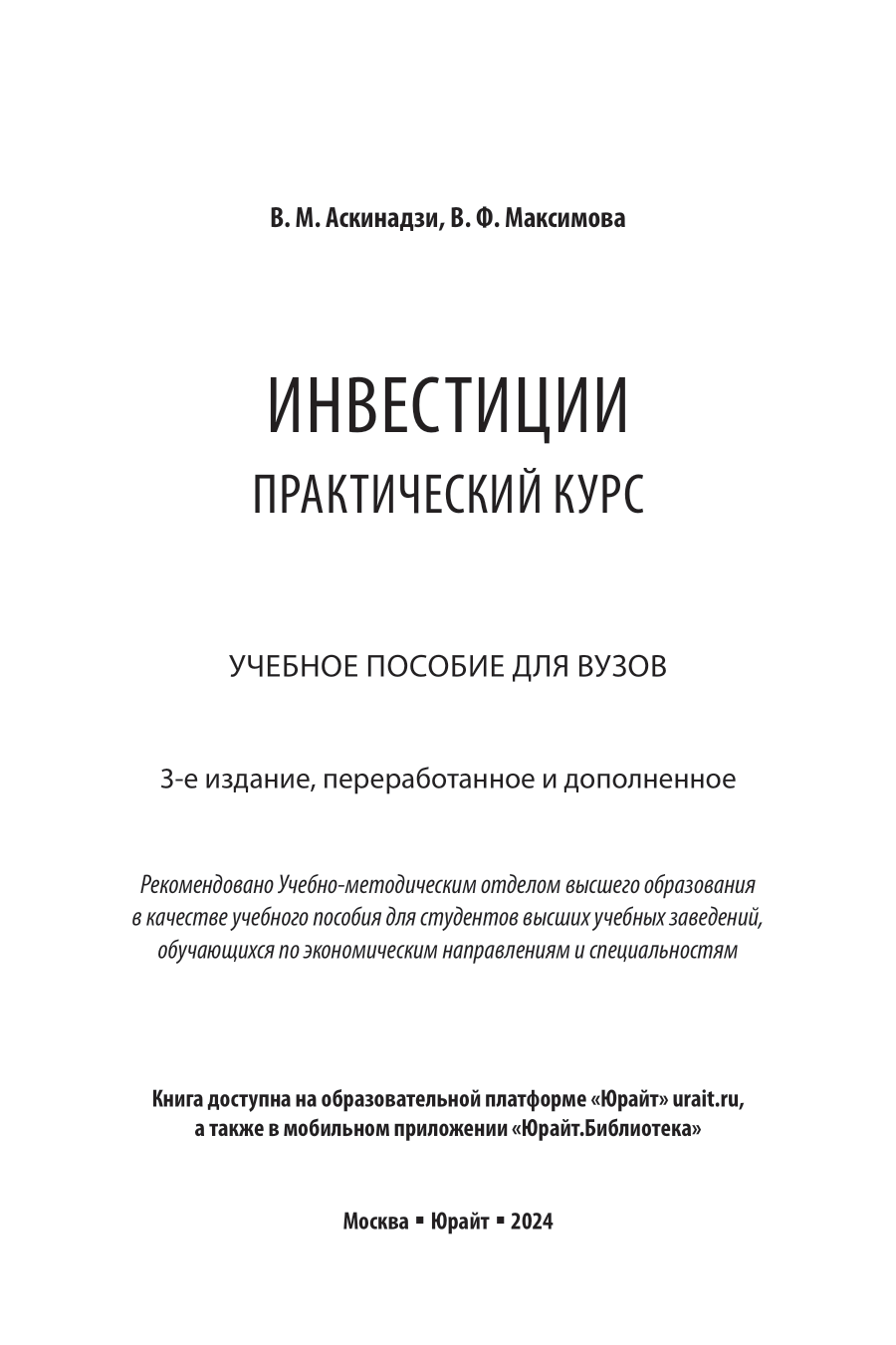 Инвестиции. Практический курс 3-е изд. пер. и доп. Учебное пособие для вузов (Виктор Михайлович Аскинадзи); ЮРАЙТ, 2024