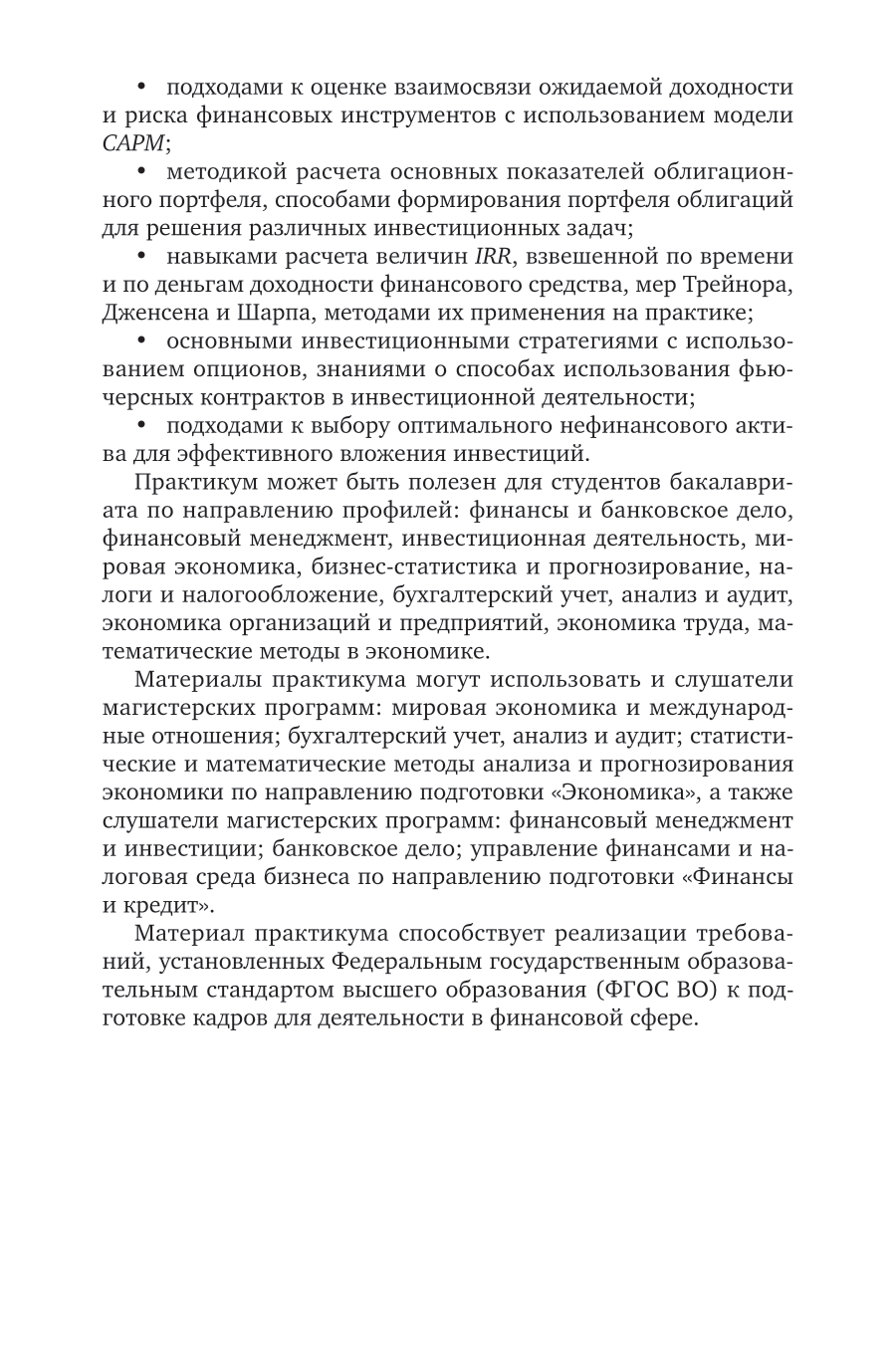Практикум по курсу «Инвестиции» содержательно соответствует одноименному учебнику В. М. Аскинадзи и В. Ф. Максимовой. В состав Практикума включены тесты, расчетные задания, ситуации и вопросы для обсуждения. В конце книги даны ответы на тестовые задания, приведены решения ключевых задач. Представленные в издании вопросы и задания разработаны авторами в процессе многолетнего преподавания дисциплин инвестиционного профиля в Московском государственном университете экономики, статистики и информатики (МЭСИ) и других высших учебных заведениях Москвы. Главная цель практикума - способствовать качественному усвоению основ инвестиционной деятельности, привитию навыков расчета ключевых показателей инвестиционных проектов, обучению способам формирования оптимальных портфелей с использованием финансовых инструментов, постижению особенностей оценки результатов инвестирования.