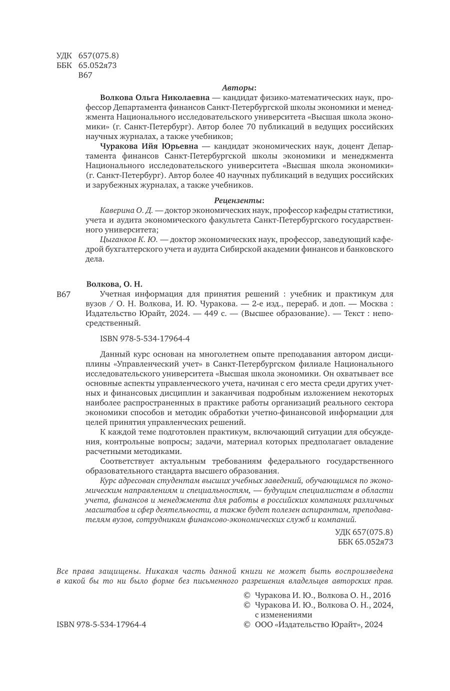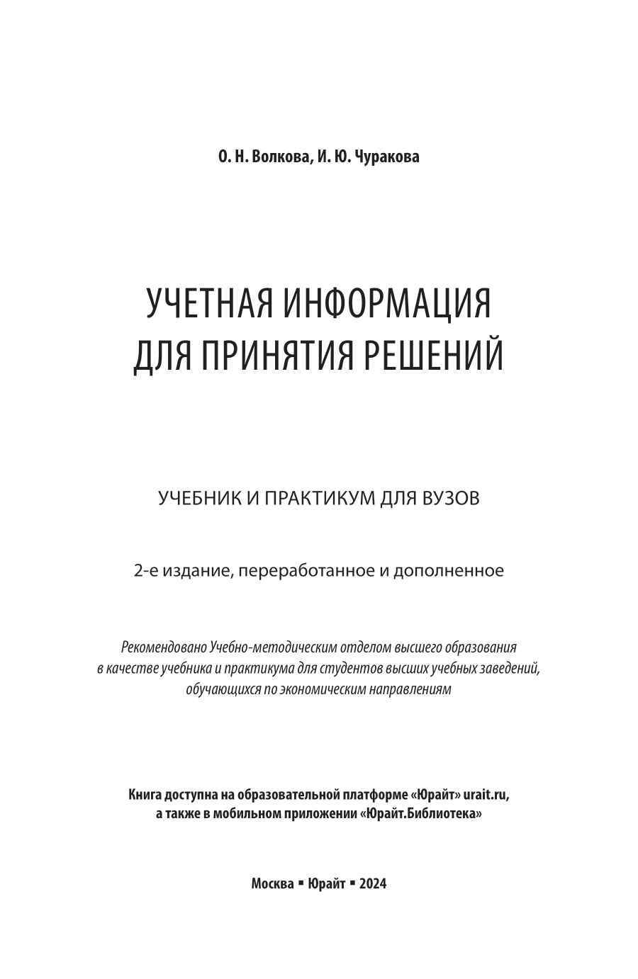 Учетная информация для принятия решений 2-е изд. пер. и доп. Учебник и практикум для вузов (Ольга Николаевна Волкова); ЮРАЙТ, 2024