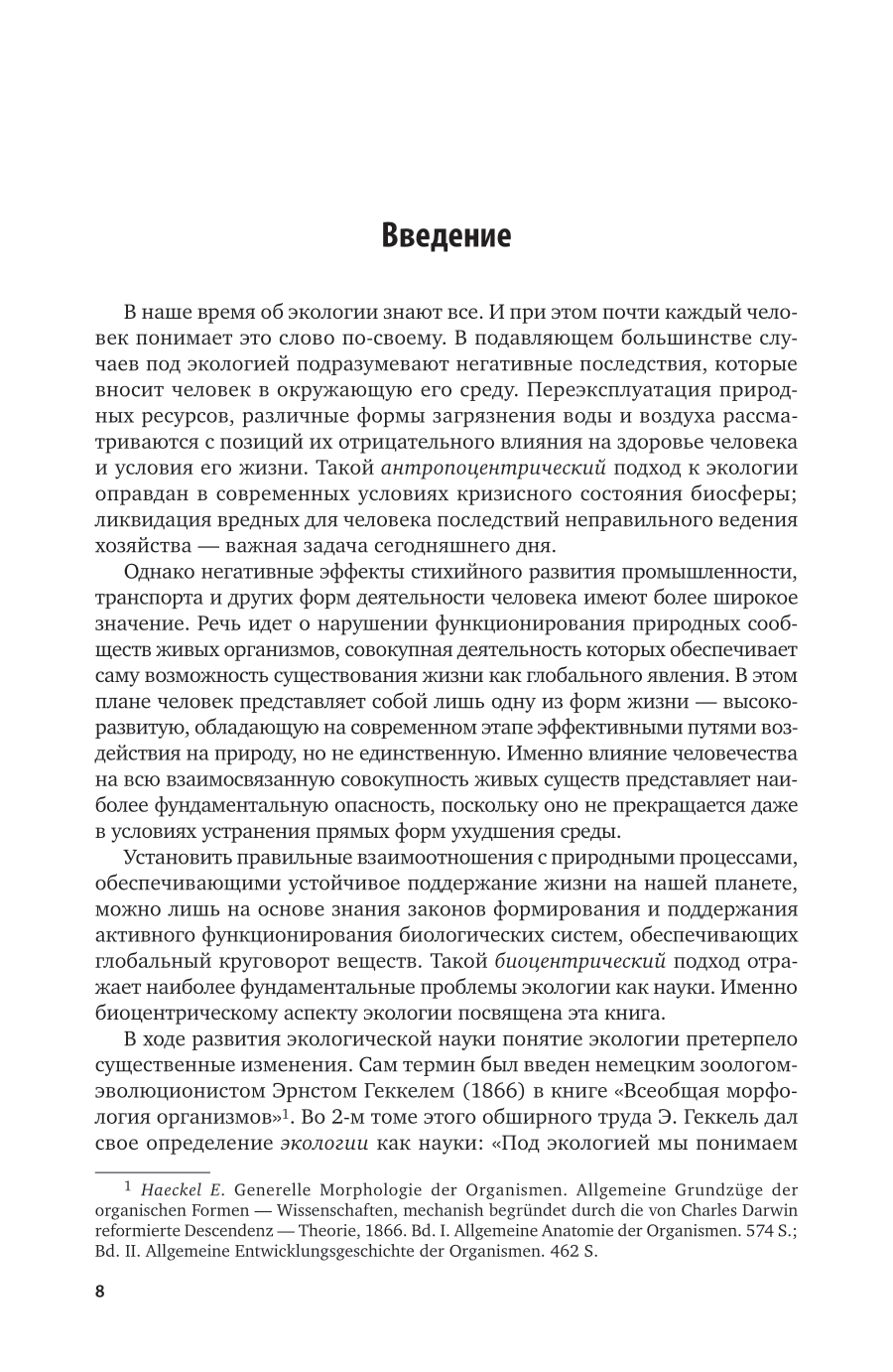 В учебнике приводятся фундаментальные проблемы экологии как биологической науки, излагаются основные механизмы и закономерности устойчивого существования биологических систем разного уровня в условиях сложной и динамической среды. Материал подан в общей форме, без разделения на экологию животных и экологию растений. Проблемы современного антропогенного влияния на экосистемы освещаются в плане наиболее общих экологических закономерностей, определяющих научные основы охраны природы и рационального использования биологических ресурсов. Многочисленные фактические данные, приведенные в книге, не требуют заучивания, а лишь должны помочь в понимании общей направленности экологических процессов