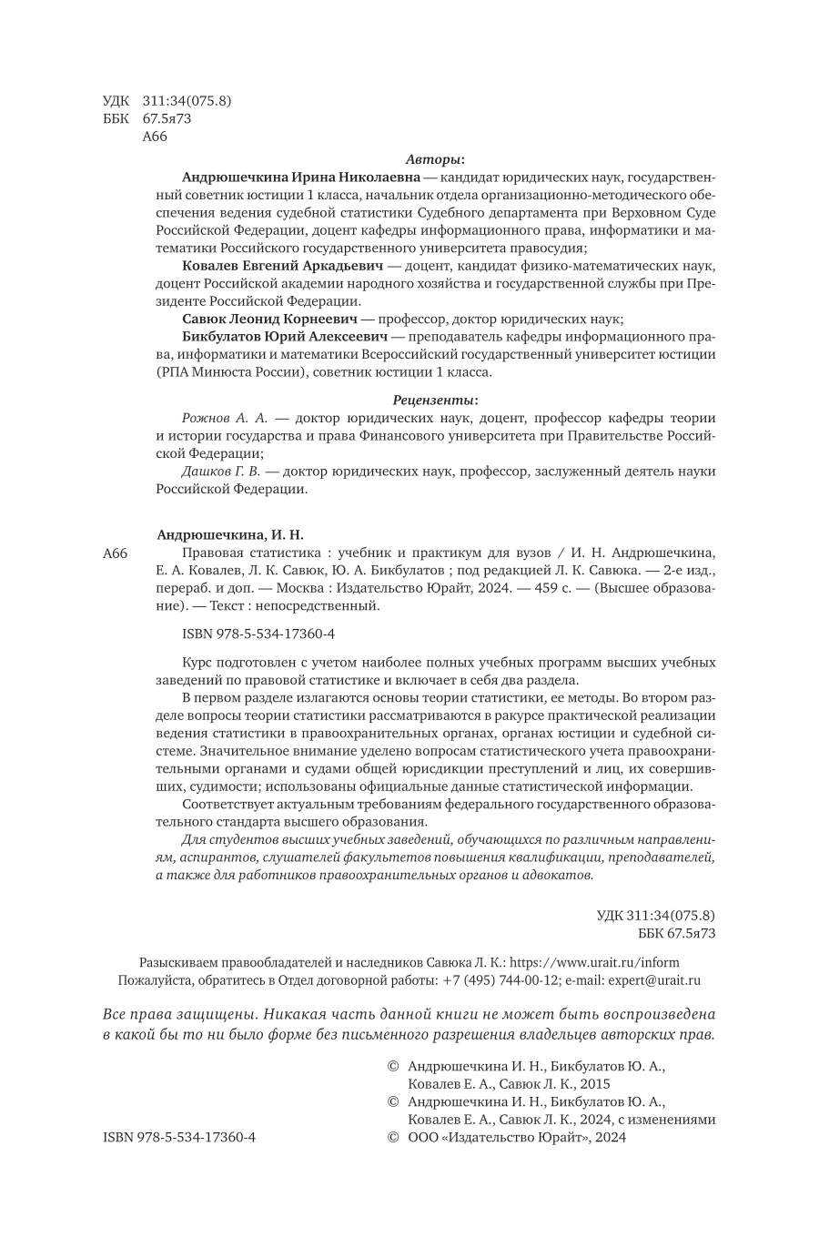 Правовая статистика 2-е изд. пер. и доп. Учебник и практикум для вузов (Андрюшечкина Ирина Николаевна, Ковалев Евгений Аркадьевич, Савюк Леонид Корнеевич, Бикбулатов Юрий Алексеевич), 2024
