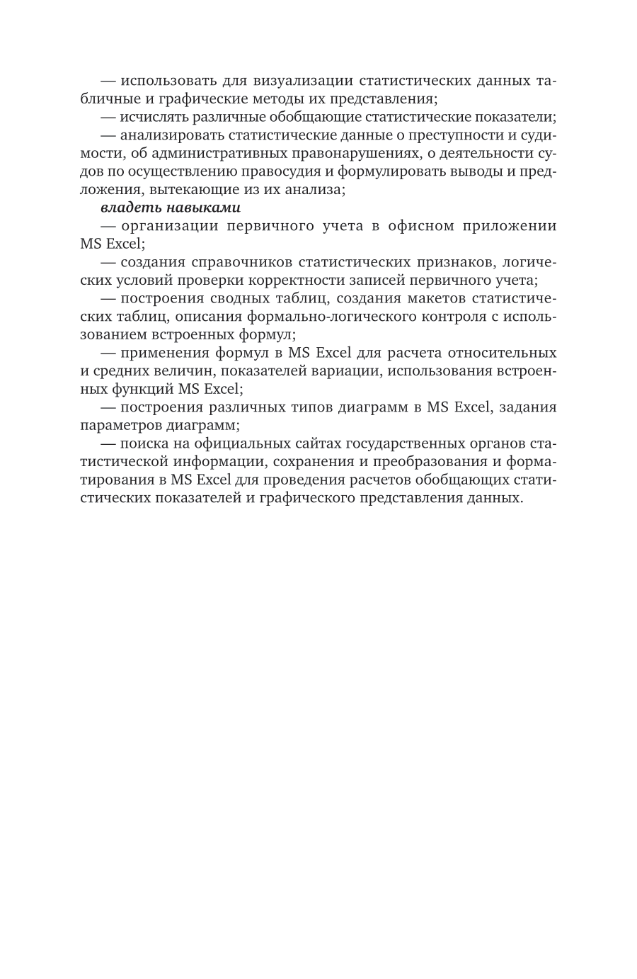Курс отличается новаторским подходом к освещению актуальных вопросов правовой статистики, рассматривая не только количественные данные о правовых явлениях, объектах правовой действительности, в том числе преступности, но и совокупность методов их исследования, основанных на анализе статистических показателей деятельности правоохранительных органов и судов общей юрисдикции. Авторы исходили из того, что этот курс должен быть, с одной стороны, довольно широким, чтобы играть развивающую гуманитарную роль, с другой - достаточно содержательным, чтобы студенты на основе применения элементарных математических методов, обеспечивающих объективность, научились решать несложные прикладные задачи, получать наиболее значимые результаты при обработке статистических данных. Изложение материала сопровождается примерами и упражнениями реальной практики, часть из которых предназначена для выполнения «вручную», а часть - в компьютерном классе с использованием офисного приложения MS Excel.