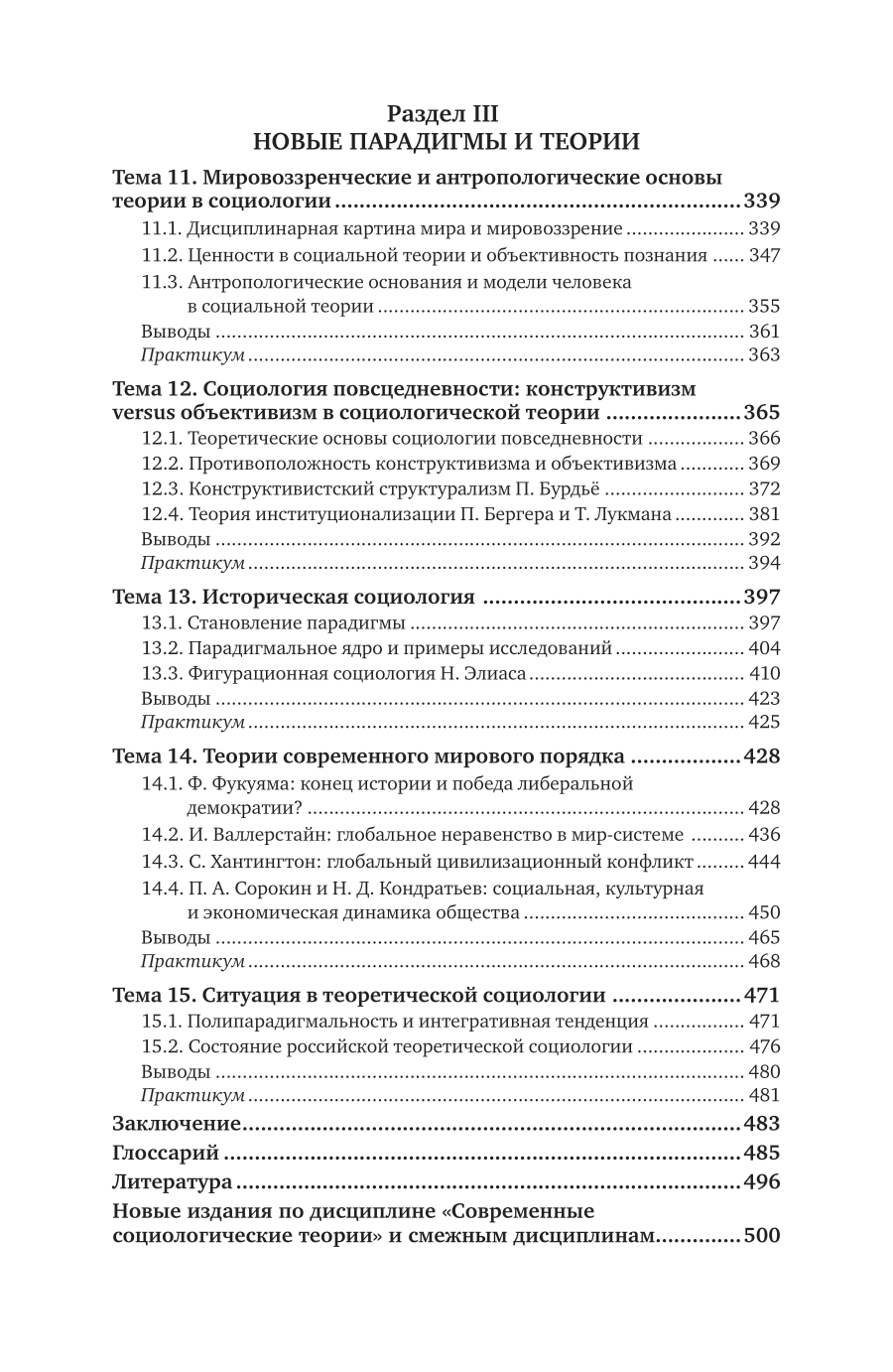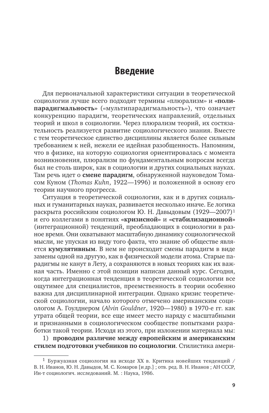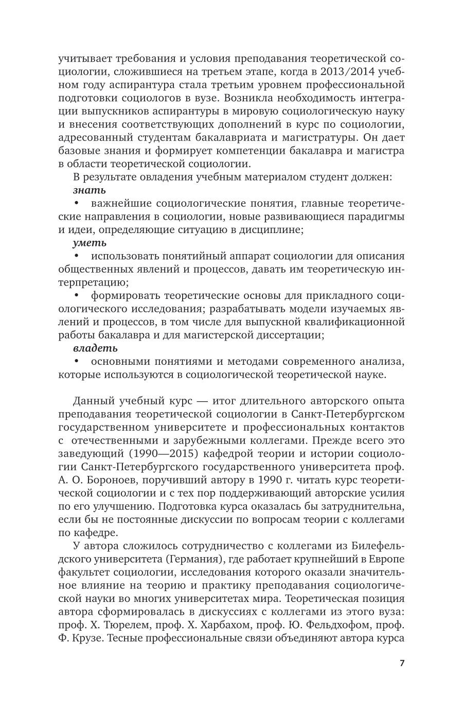 С помощью данного курса студенты могут овладеть важнейшими социологическими понятиями, основными направлениями теоретической социологии, познакомиться с конкретными теориями, научиться критически их оценивать, совершенствовать навыки выбора теоретических основ своих учебно-квалификационных и научно-исследовательских работ, сформировать компетенции, необходимые для совместной работы с коллегами в исследовательских организациях. Учитывая тенденции дисциплинарной интеграции социологии, в издании дается оценка новым идеям, парадигмам и теориям. Это позволит студентам освоить современные теории общества, социального взаимодействия, коммуникации, разобраться в сложных вопросах теоретической социологии. Освоив материал курса, обучающийся сможет сам пополнять знания, изучать новые концепции, сравнивать их, выбирать и использовать для профессиональных исследований при подготовке выпускной квалификационной работы бакалавра или магистерской диссертации. Соответствует актуальным требованиям федерального государственного образовательного стандарта высшего образования. Для бакалавров и магистров высших учебных заведений, обучающимся по социальным (обществоведческим) и гуманитарным направлениям и специальностям, а также аспирантов, работающих над кандидатской диссертацией, научных руководителей студентов, всех интересующихся теорией современного общества.
