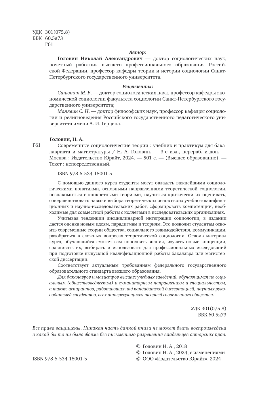 Современные социологические теории 3-е изд. пер. и доп. Учебник и практикум для бакалавриата и магистратуры (Николай Александрович Головин); ЮРАЙТ, 2024