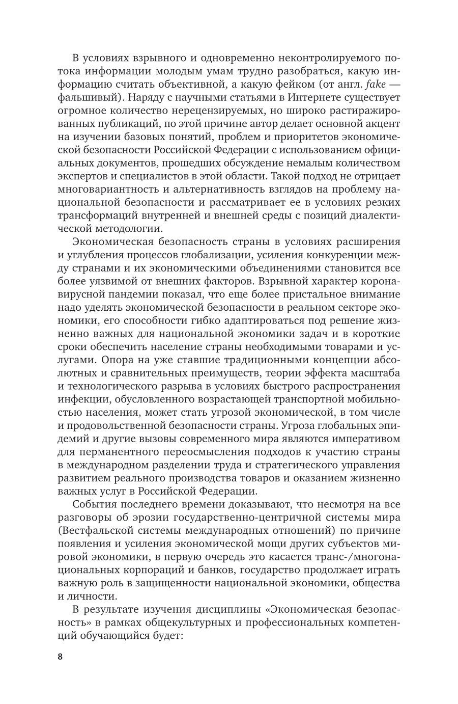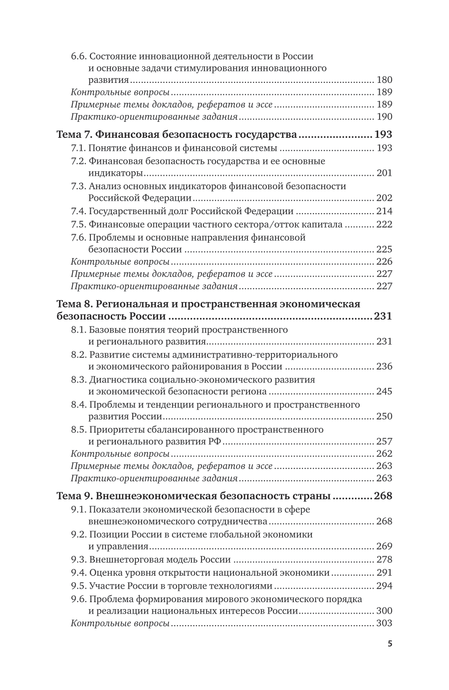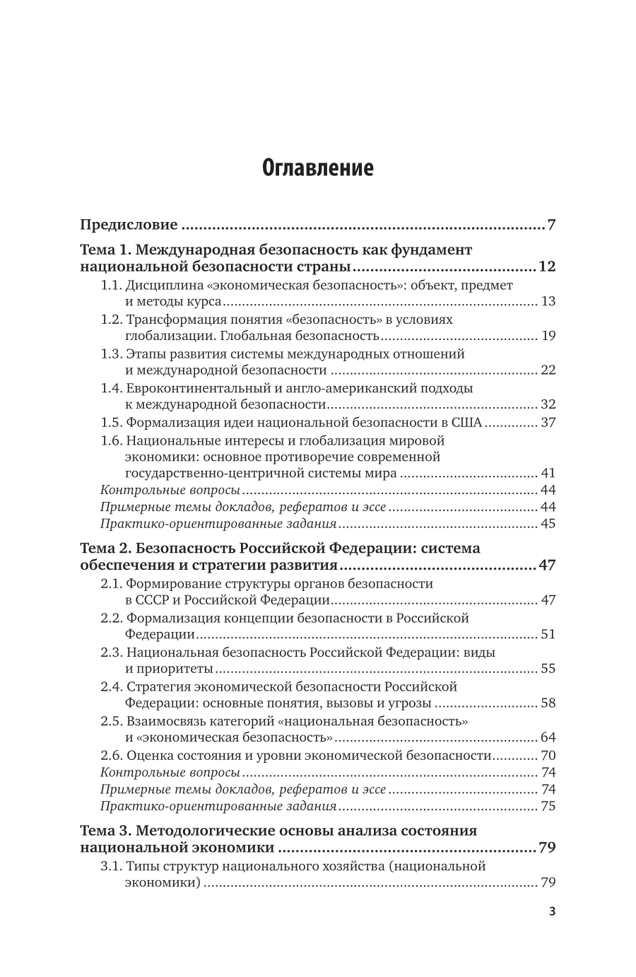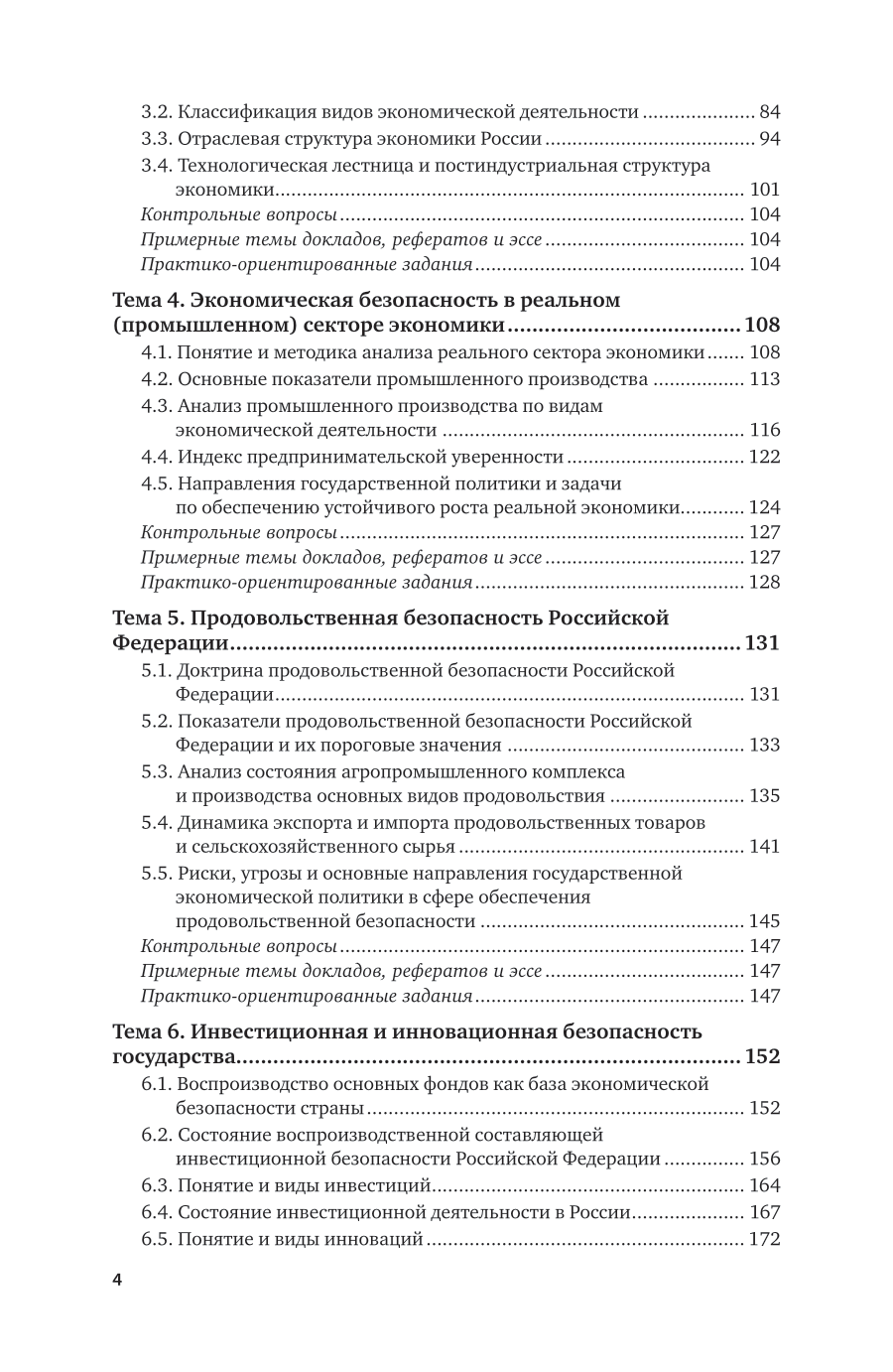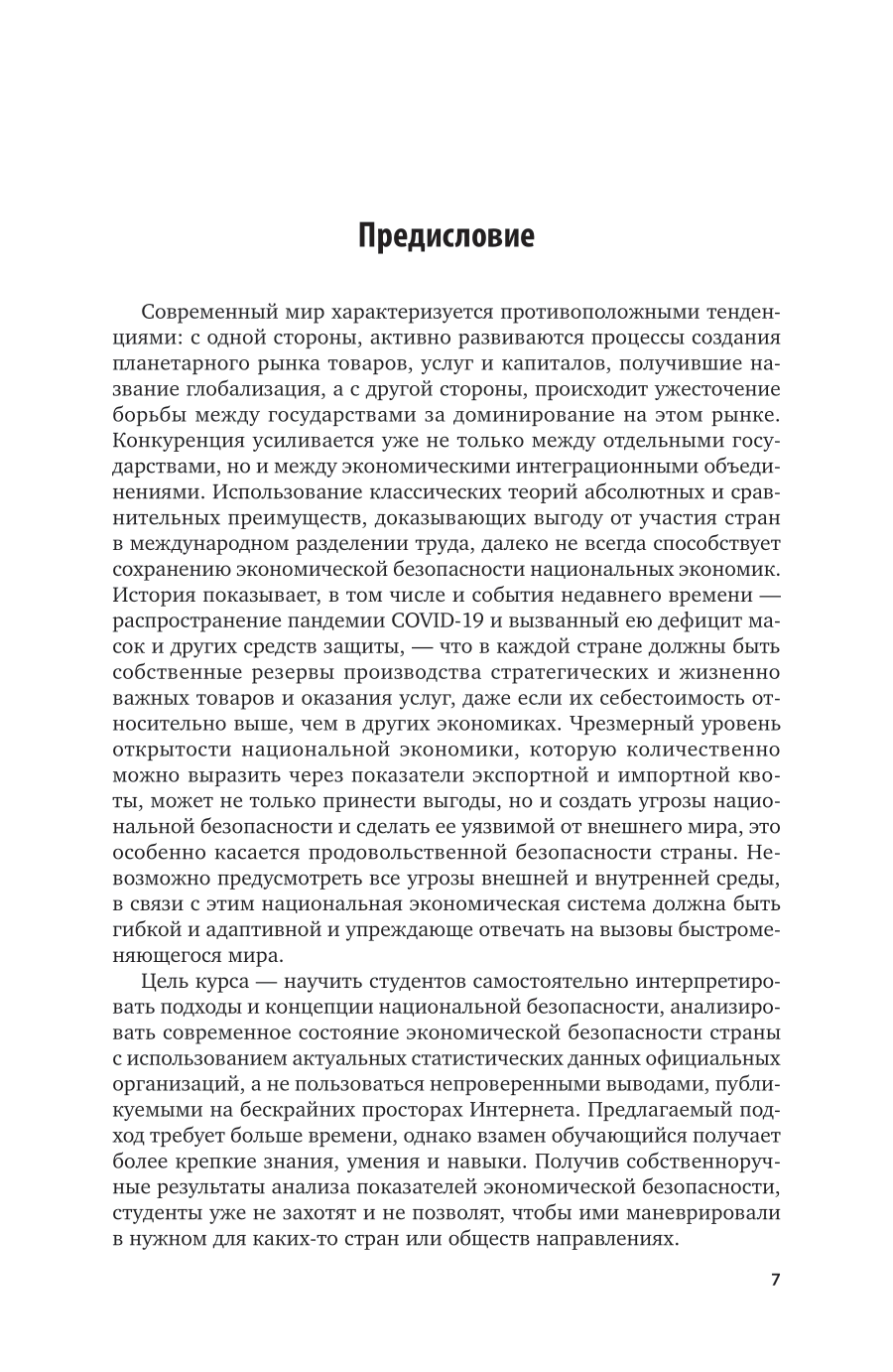 В курсе рассмотрено современное состояние, проблемы и направления обеспечения экономической безопасности в различных сферах национальной экономики, обозначенных в Стратегии экономической безопасности Российской Федерации до 2030 года. Все темы издания содержат контрольные вопросы, темы докладов, рефератов и эссе, практико-ориентированные задания, основанные на актуальных статистических данных, что позволит студентам самостоятельно выявлять тенденции развития экономической безопасности страны. Соответствует актуальным требованиям федерального государственного образовательного стандарта высшего образования. Для студентов, обучающихся по направлению подготовки «Экономическая безопасность», «Таможенное дело», «Экономика», издание может быть полезно преподавателям, а также всем, кто интересуется проблемами экономической безопасности России.