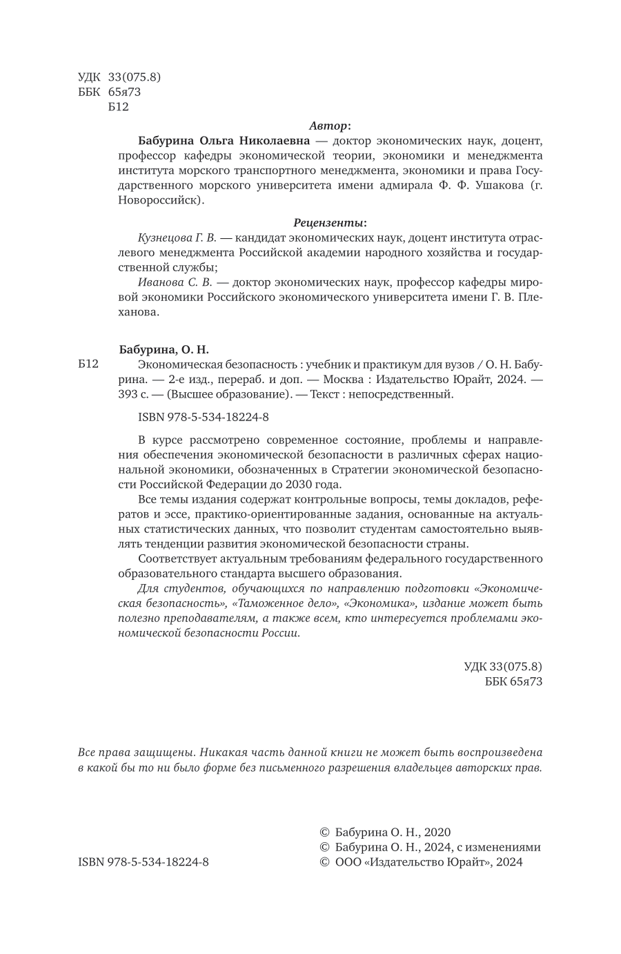 Экономическая безопасность 2-е изд. пер. и доп. Учебник и практикум для вузов (Ольга Николаевна Бабурина); ЮРАЙТ, 2024