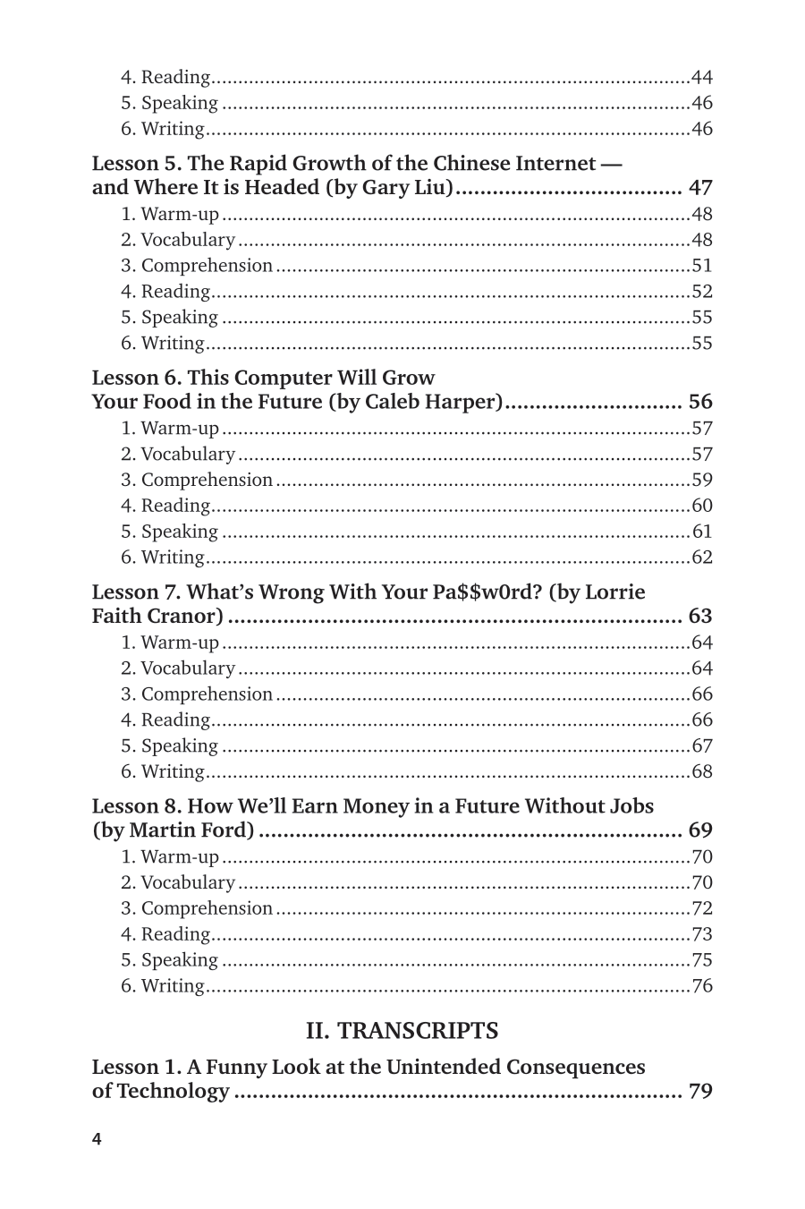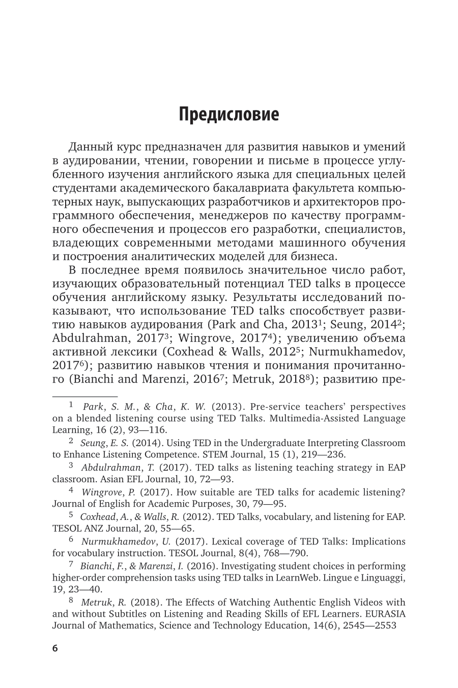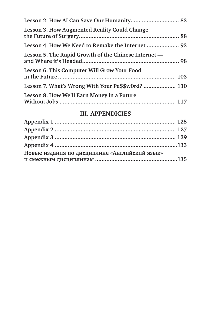 Курс предназначен для развития навыков аудирования, чтения и говорения в процессе углубленного изучения английского языка для специальных целей в сфере информационных технологий. Состоит из уроков, разработанных на основе аутентичных видеоматериалов, охватывающих различные сферы использования современных информационных технологий. Может быть использован как для аудиторных занятий, так и для самостоятельной работы. Преимущества курса: тщательно отобранные аутентичные аудиоматериалы; интересные и мотивирующие уроки; новые знания в сфере информационных технологий; общение на профессиональные темы. Курс соответствует актуальным требованиям Федерального государственного образовательного стандарта высшего образования. Для студентов высших учебных заведений, изучающих компьютерные науки с уровнем языковой подготовки В2-C1.