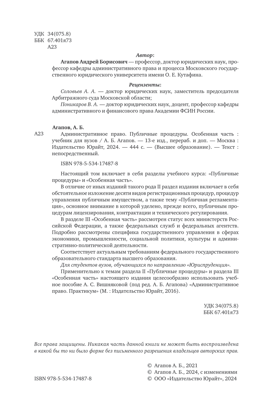 Административное право. Публичные процедуры. Особенная часть 13-е изд. пер. и доп. Учебник для вузов (Андрей Борисович Агапов); ЮРАЙТ, 2024