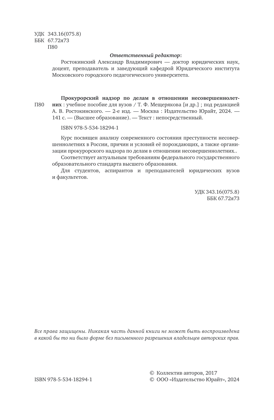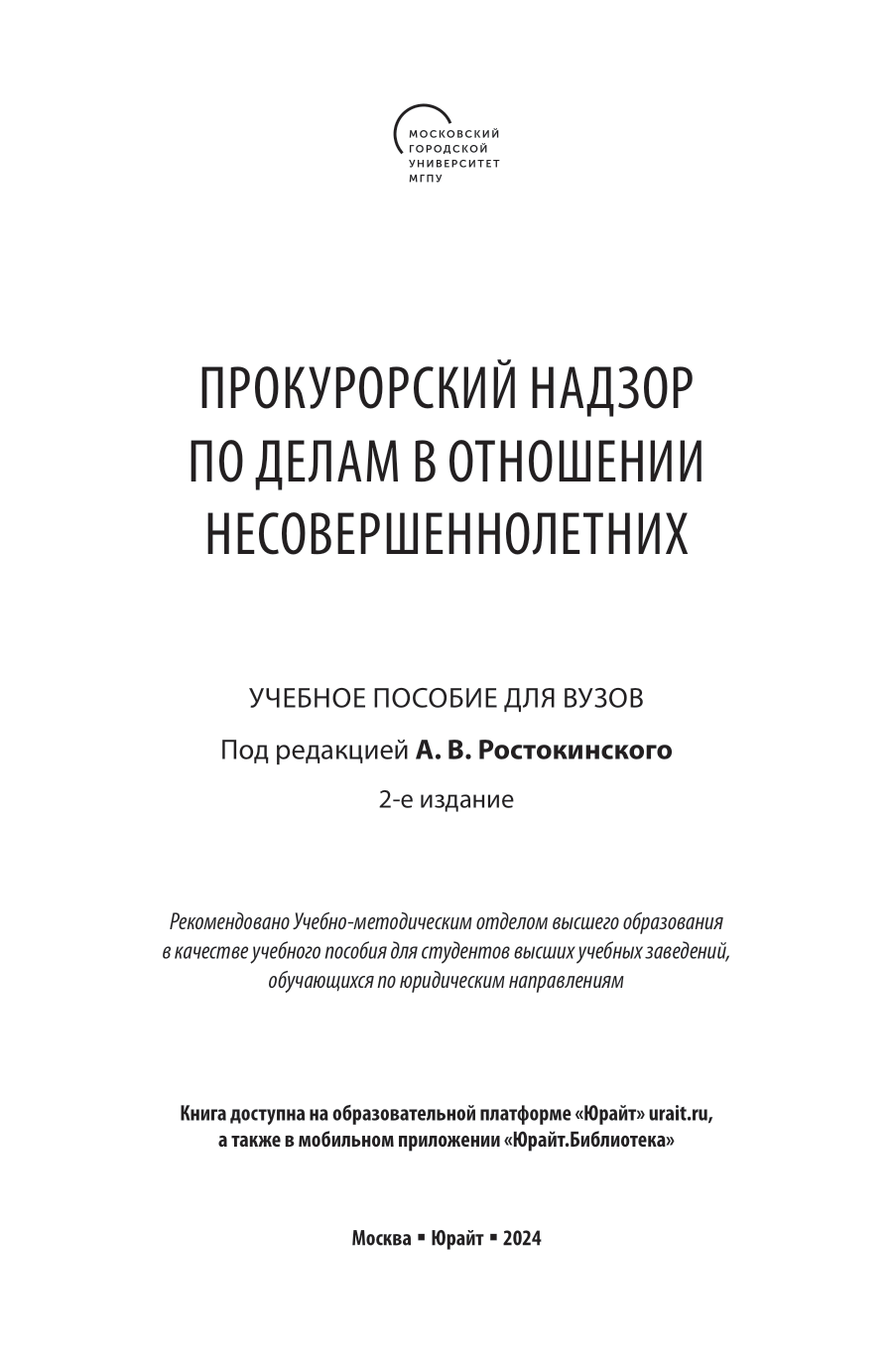 Прокурорский надзор по делам в отношении несовершеннолетних 2-е изд. Учебное пособие для вузов (Тамара Федоровна Мещерякова); ЮРАЙТ, 2024