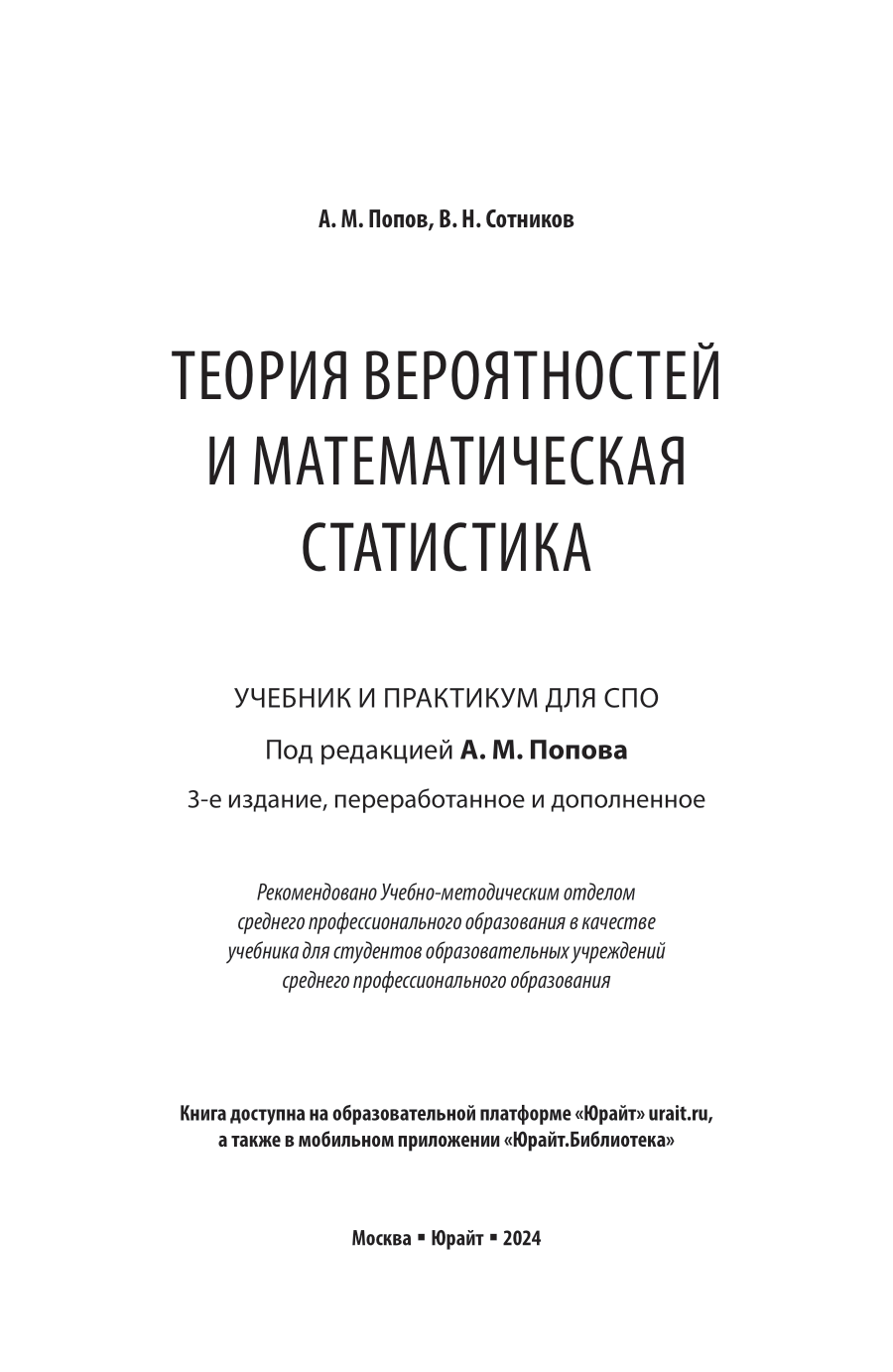 Теория вероятностей и математическая статистика 3-е изд. пер. и доп. Учебник для СПО (Валерий Николаевич Сотников); ЮРАЙТ, 2024