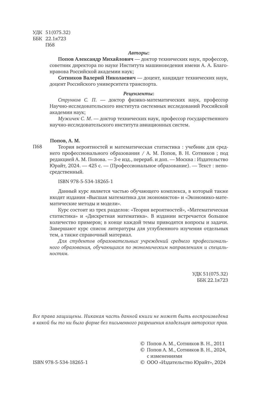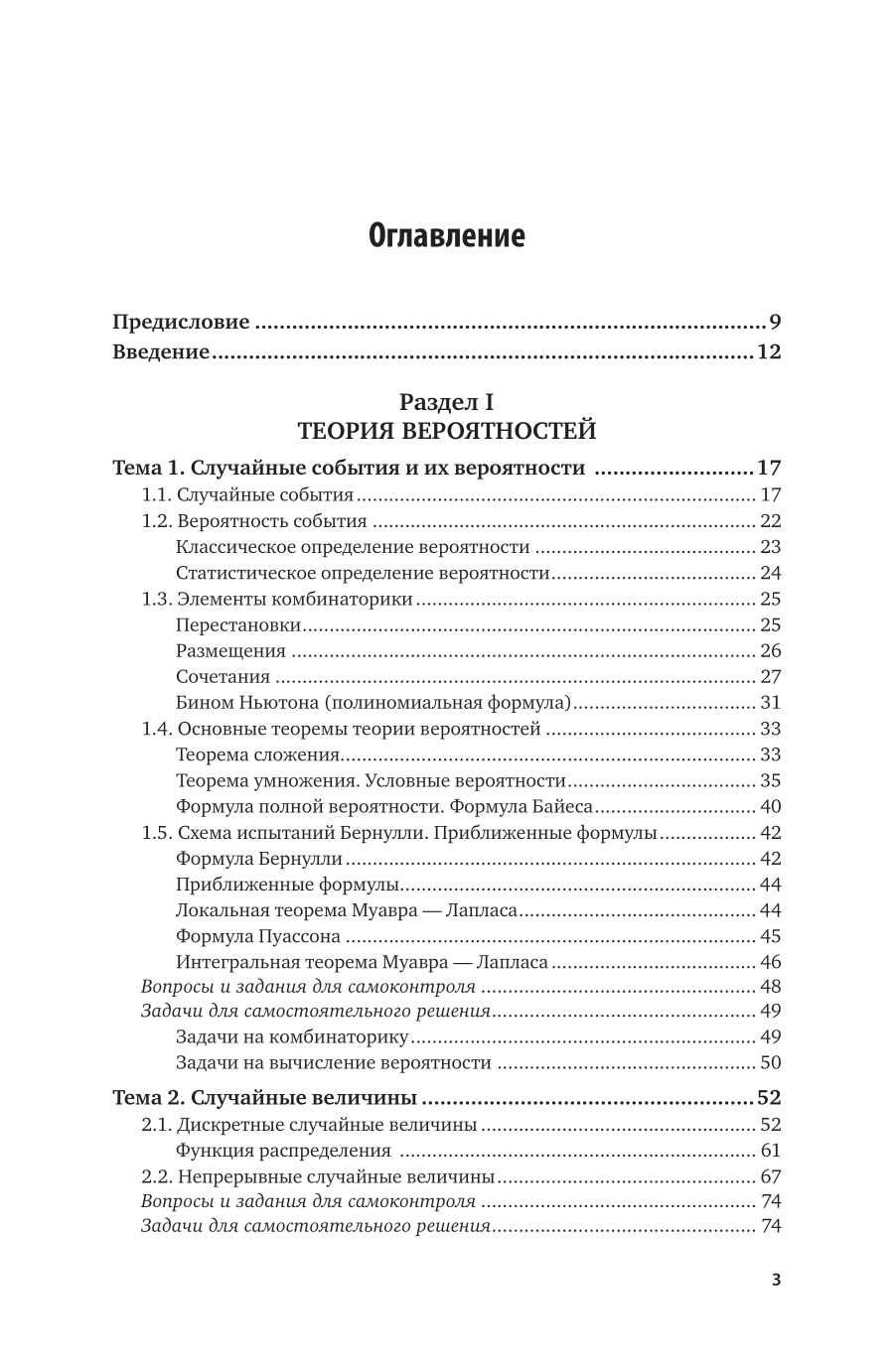 Данный курс является частью обучающего комплекса, в который также входят издания «Высшая математика для экономистов» и «Экономико-математические методы и модели». Курс состоит из трех разделов: «Теория вероятностей», «Математическая статистика» и «Дискретная математика». В издании встречается большое количество примеров; в конце каждой темы приводятся вопросы и задачи. Завершают курс список литературы для углубленного изучения отдельных тем, а также справочный материал. Для студентов образовательных учреждений среднего профессионального образования, обучающихся по экономическим направлениям и спецальностям.