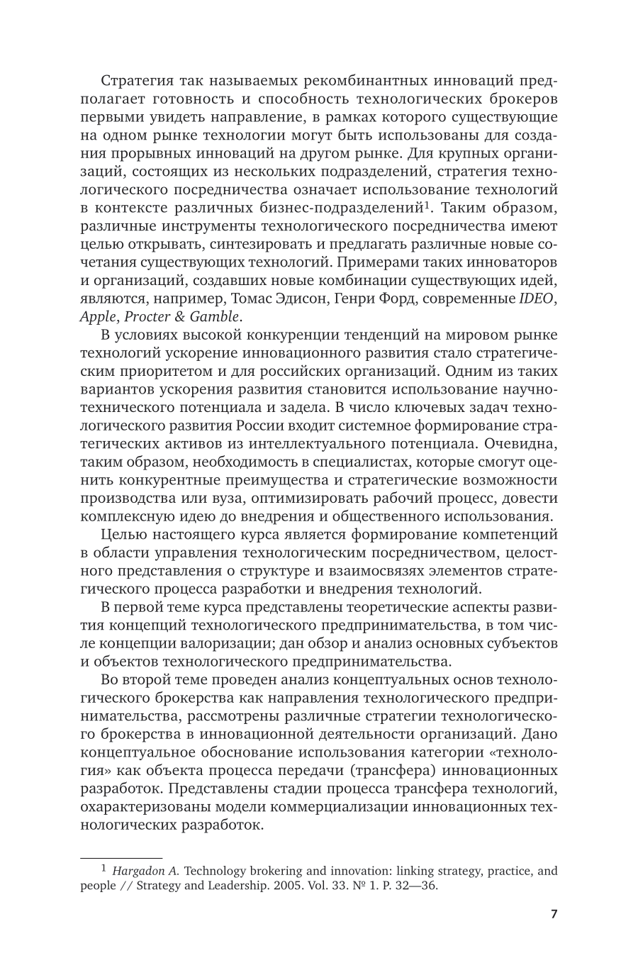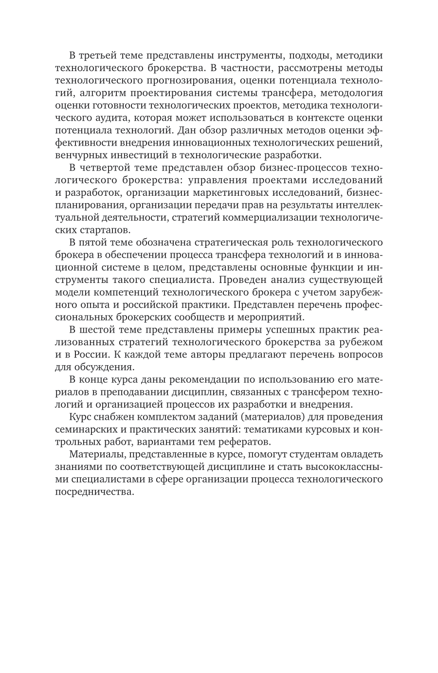 В курсе последовательно изложены методические подходы к осуществлению процесса технологического брокерства. Представлены концептуальные основы технологического брокерства как направления технологического предпринимательства, стратегии технологического брокерства в инновационной деятельности организаций, охарактеризованы модели коммерциализации инновационных технологических разработок. Рассмотрены различные методы оценки потенциала технологий, алгоритм проектирования системы трансфера технологий, методология оценки готовности технологических проектов, методика технологического аудита, которая может использоваться в контексте оценки стратегического потенциала технологий. Представлены отдельные аспекты стратегирования специализированных трудовых ресурсов (технологический брокер), необходимых для успешного трансфера технологий. Дан обзор различных методов оценки эффективности внедрения инновационных технологических решений, венчурных инвестиций в технологические разработки. Изложение материала подчинено основной цели - формирование у студентов знаний, умений и навыков по управлению процессами технологического развития. Соответствует федеральному государственному образовательному стандарту высшего образования. Предназначен для студентов высших учебных заведений, аспирантов, преподавателей, слушателей системы повышения квалификации, а также читателей, интересующихся вопросами долгосрочного управления процессом разработки и внедрения технологических разработок.