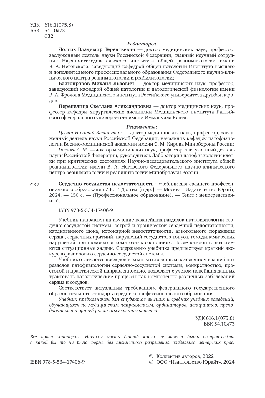 Сердечно-сосудистая недостаточность. Учебник для СПО (Владимир Терентьевич Долгих); ЮРАЙТ, 2024