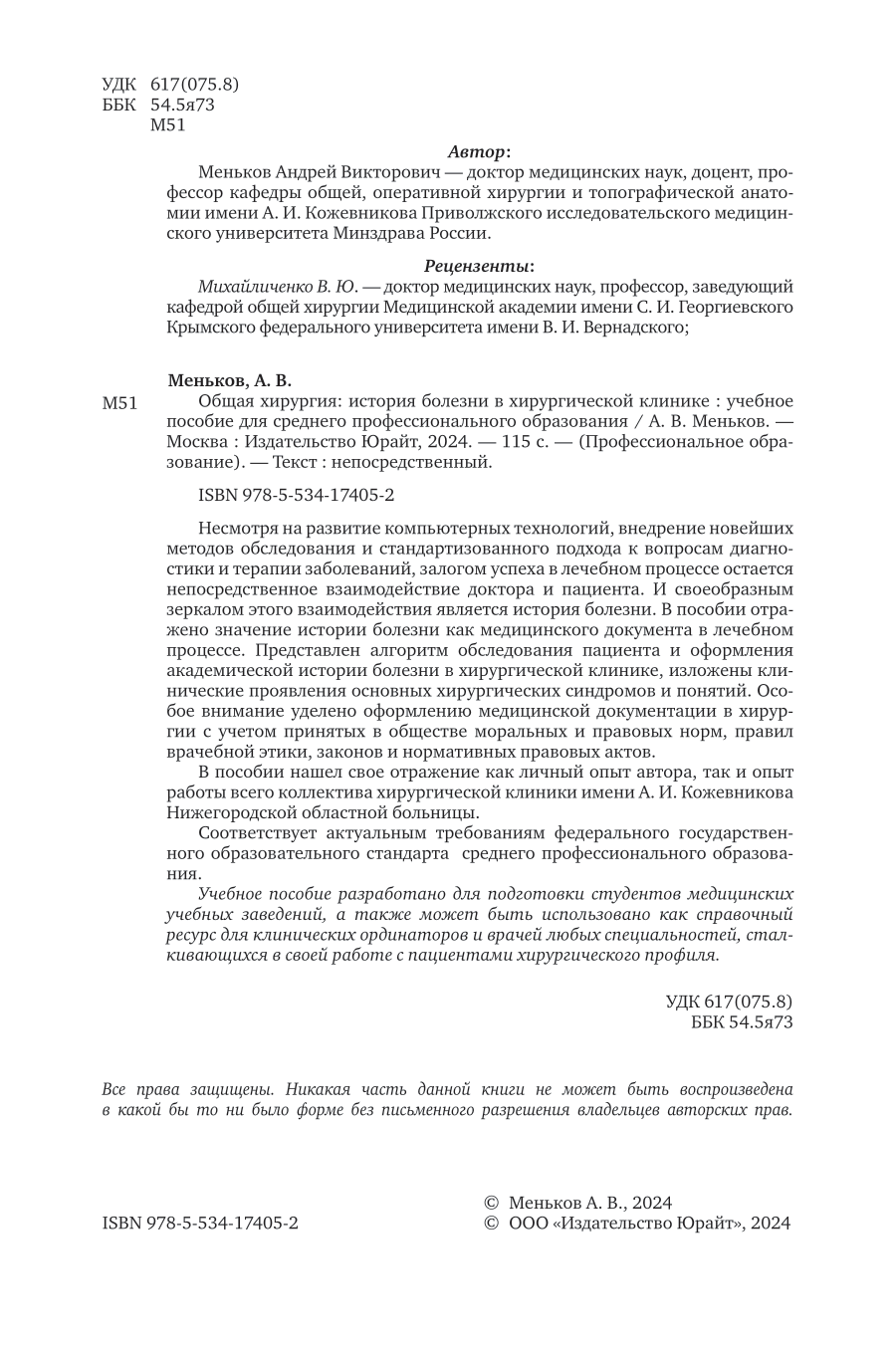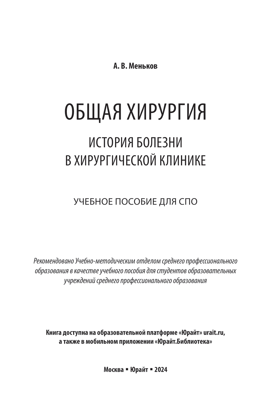 Общая хирургия: история болезни в хирургической клинике. Учебное пособие для СПО (Андрей Викторович Меньков); ЮРАЙТ, 2024