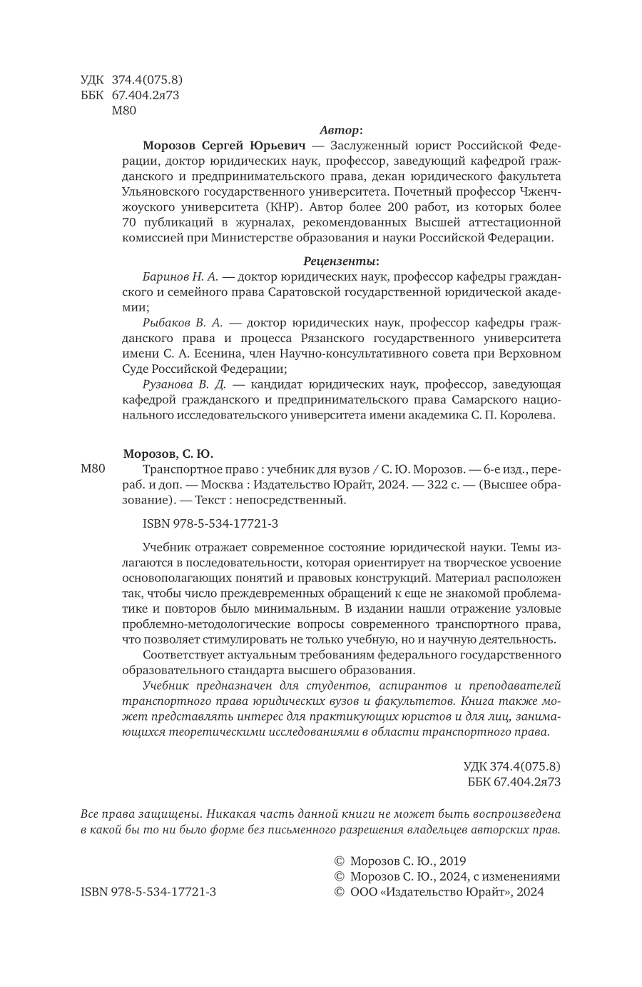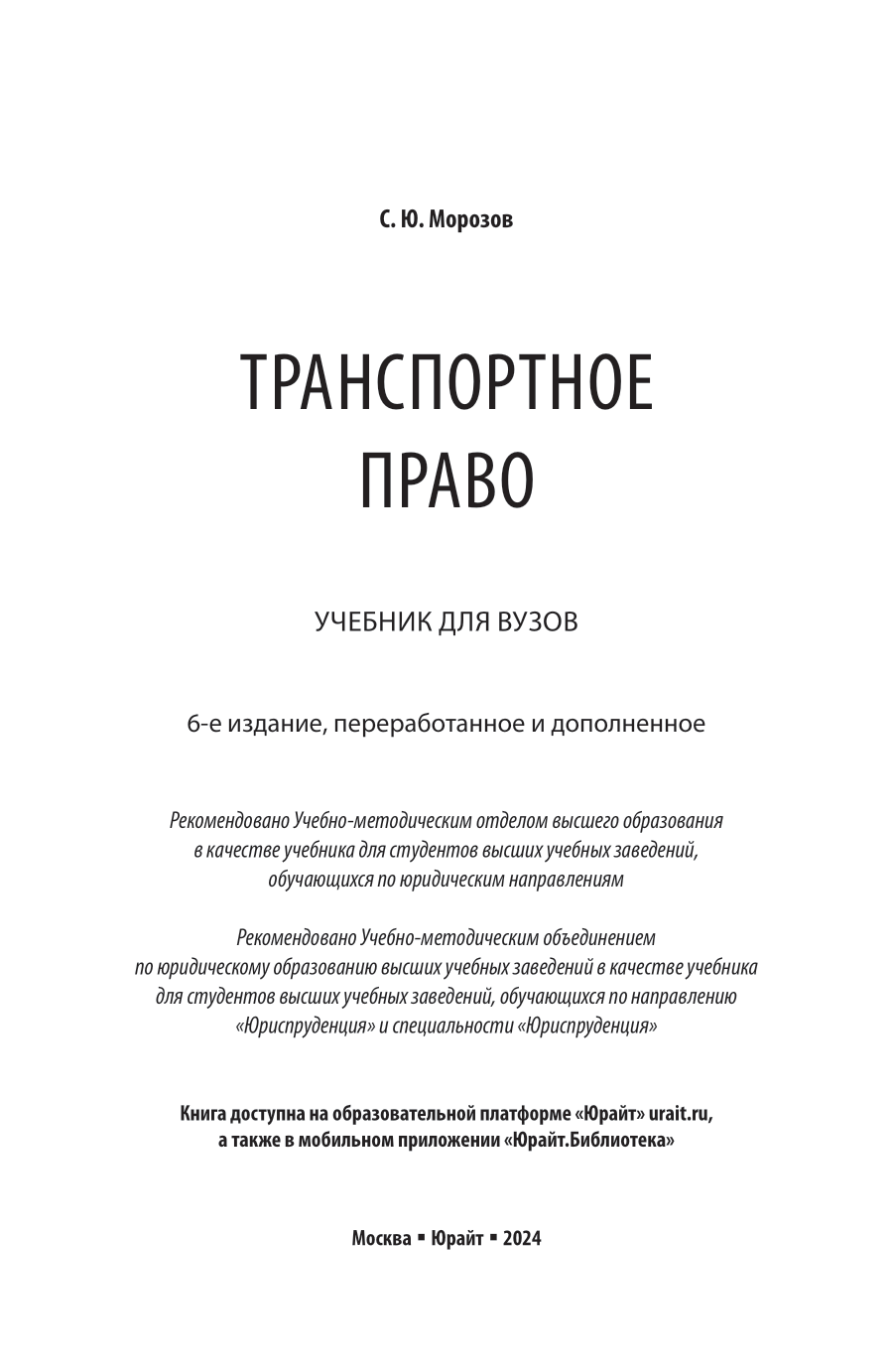 Транспортное право 6-е изд. пер. и доп. Учебник для вузов (Сергей Юрьевич Морозов); ЮРАЙТ, 2024