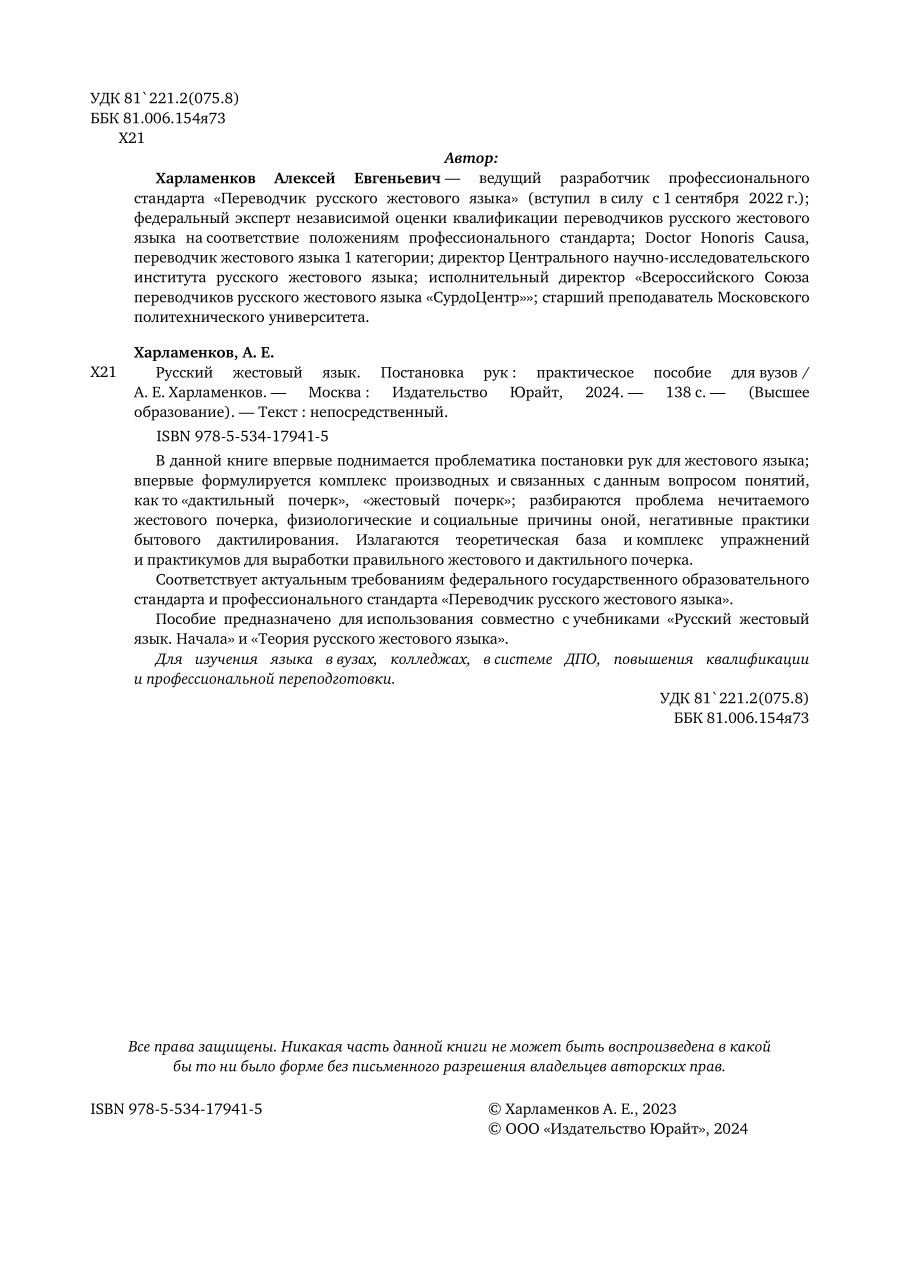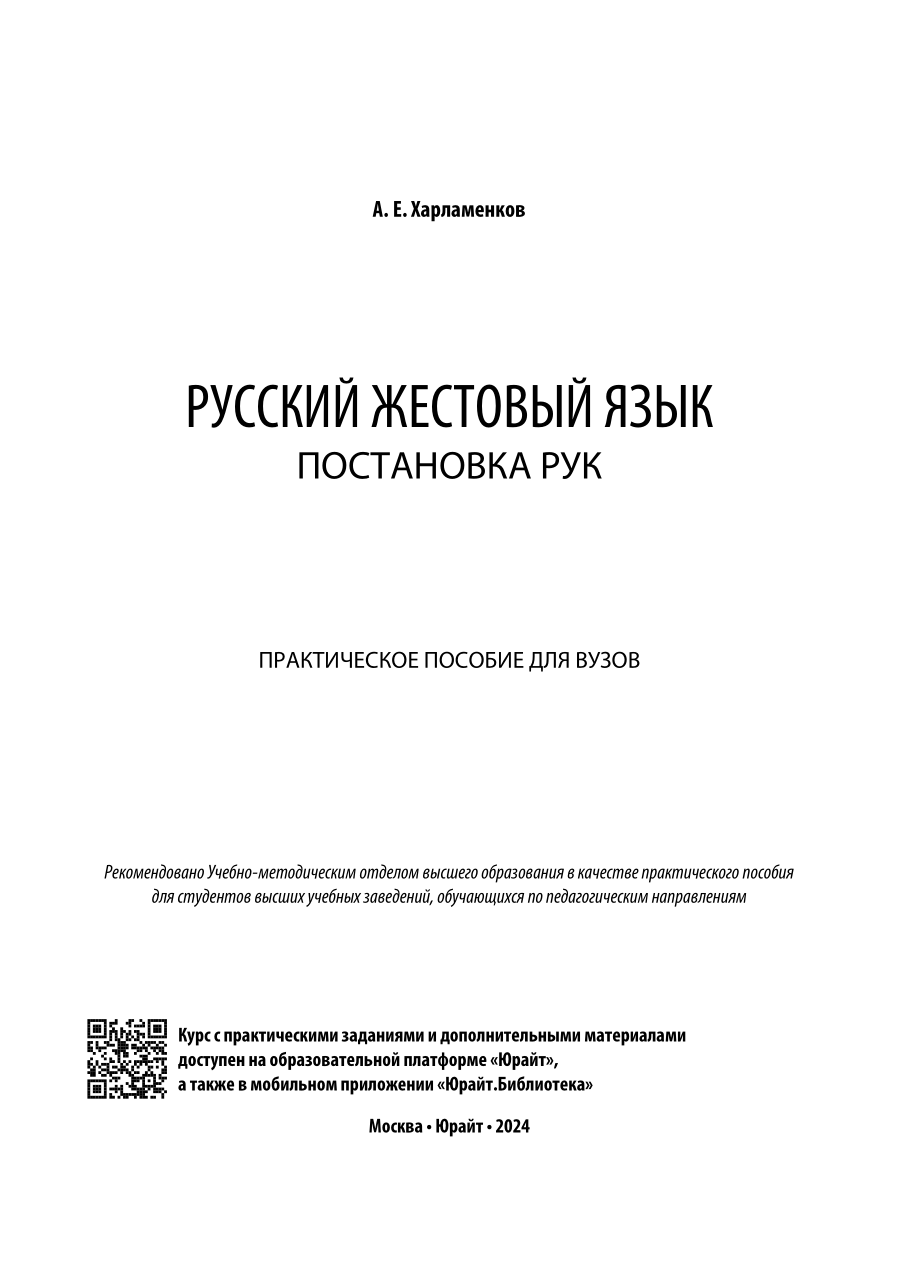 Русский жестовый язык. Постановка рук. Практическое пособие для вузов (Алексей Евгеньевич Харламенков); ЮРАЙТ, 2023