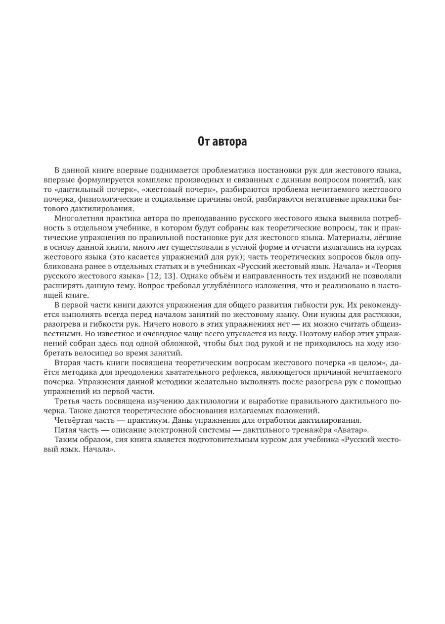 В данной книге впервые поднимается проблематика постановки рук для жестового языка; впервые формулируется комплекс производных и связанных с данным вопросом понятий, как то «дактильный почерк», «жестовый почерк»; разбираются проблема нечитаемого жестового почерка, физиологические и социальные причины оной, негативные практики бытового дактилирования. Излагаются теоретическая база и комплекс упражнений и практикумов для выработки правильного жестового и дактильного почерка. Соответствует актуальным требованиям федерального государственного образовательного стандарта и профессионального стандарта «Переводчик русского жестового языка». Пособие предназначено для использования совместно с учебниками «Русский жестовый язык. Начала» и «Теория русского жестового языка». Для изучения языка в вузах, колледжах, в системе ДПО, повышения квалификации и профессиональной переподготовки.