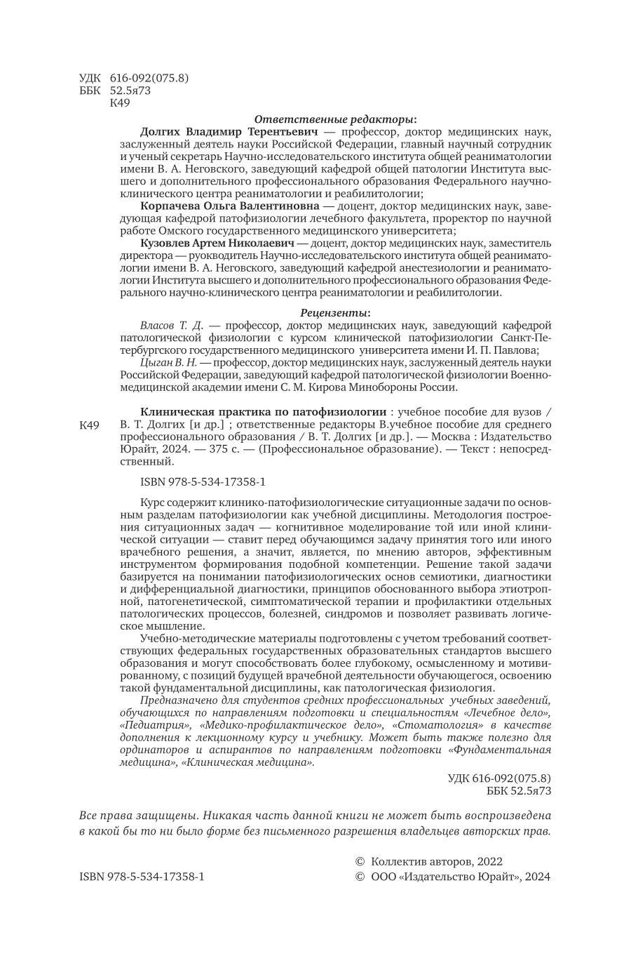 Курс содержит клинико-патофизиологические ситуационные задачи по основным разделам патофизиологии как учебной дисциплины. Методология построения ситуационных задач - когнитивное моделирование той или иной клинической ситуации - ставит перед обучающимся задачу принятия того или иного врачебного решения, а значит, является, по мнению авторов, эффективным инструментом формирования подобной компетенции. Решение такой задачи базируется на понимании патофизиологических основ семиотики, диагностики и дифференциальной диагностики, принципов обоснованного выбора этиотропной, патогенетической, симптоматической терапии и профилактики отдельных патологических процессов, болезней, синдромов и позволяет развивать логическое мышление. Учебно-методические материалы подготовлены с учетом требований соответствующих федеральных государственных образовательных стандартов высшего образования и могут способствовать более глубокому, осмысленному и мотивированному, с позиций будущей врачебной деятельности обучающегося, освоению такой фундаментальной дисциплины, как патологическая физиология. Предназначено для студентов средних профессиональных учебных заведений, обучающихся по направлениям подготовки и специальностям «Лечебное дело», «Педиатрия», «Медико-профилактическое дело», «Стоматология» в качестве дополнения к лекционному курсу и учебнику. Может быть также полезно для ординаторов и аспирантов по направлениям подготовки «Фундаментальная медицина», «Клиническая медицина».