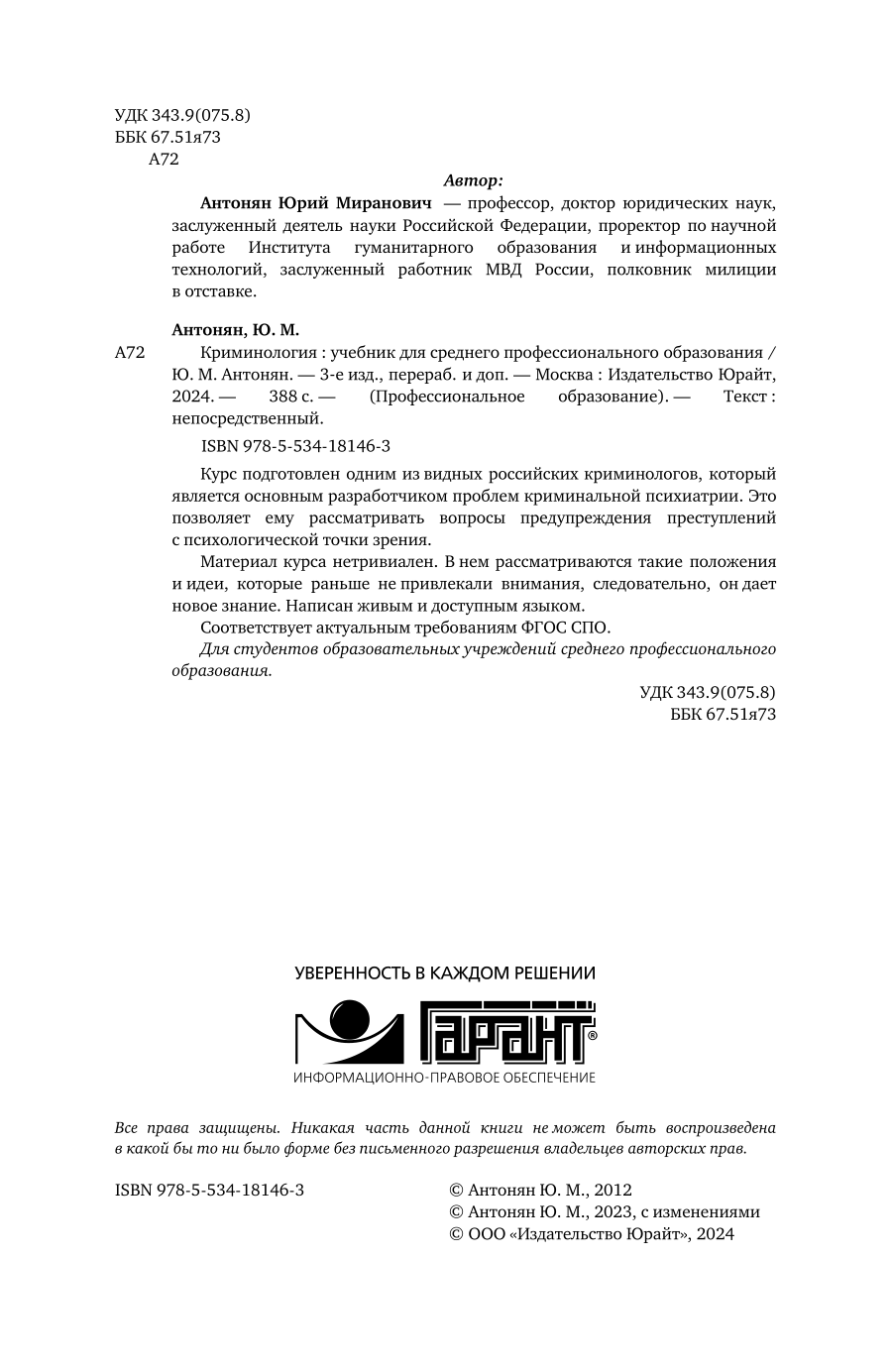 Криминология 3-е изд. пер. и доп. Учебник для СПО (Юрий Миранович Антонян); ЮРАЙТ, 2023