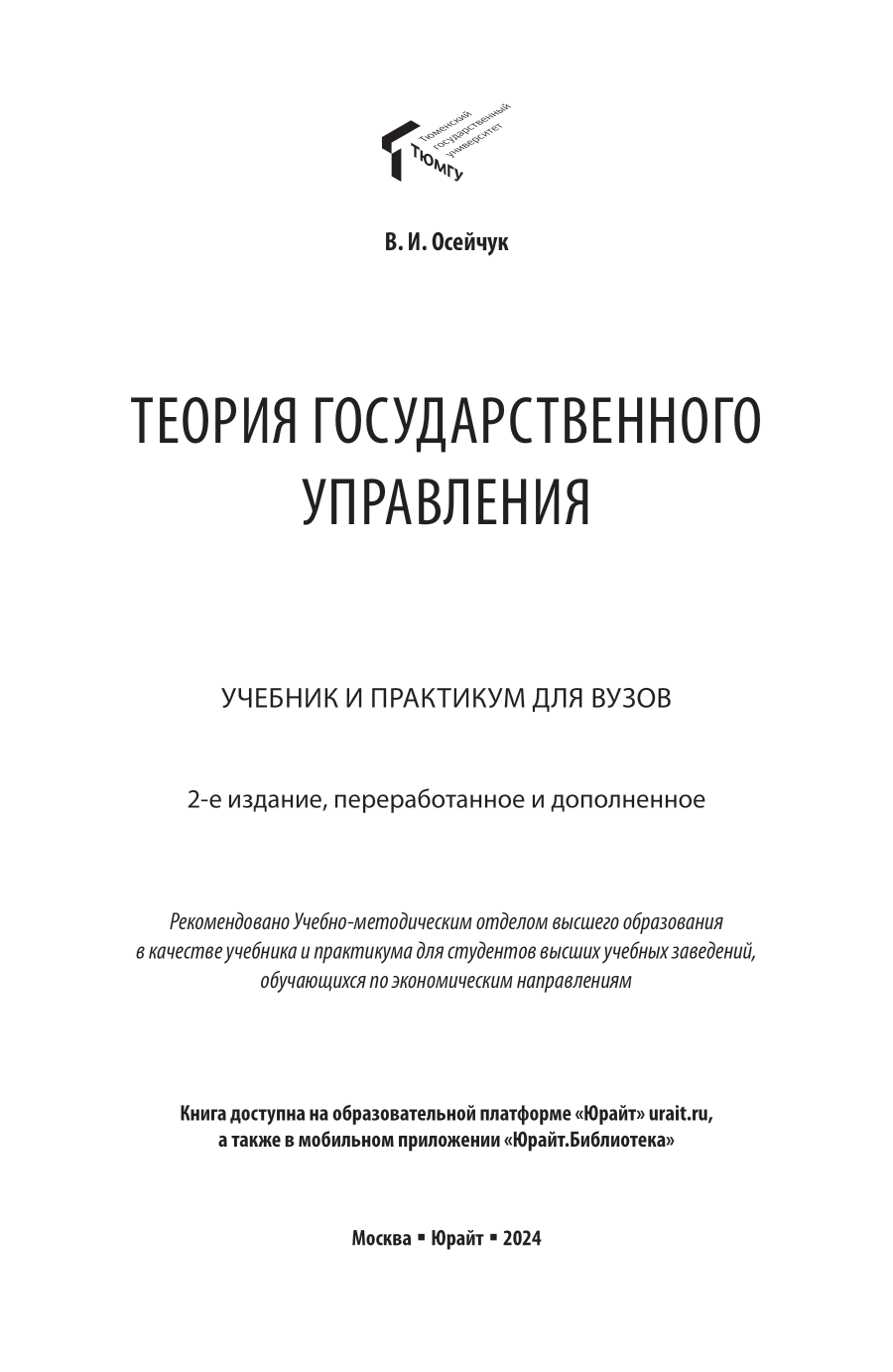 Теория государственного управления 2-е изд. пер. и доп. Учебник и практикум для вузов (Владимир Иванович Осейчук); ЮРАЙТ, 2024
