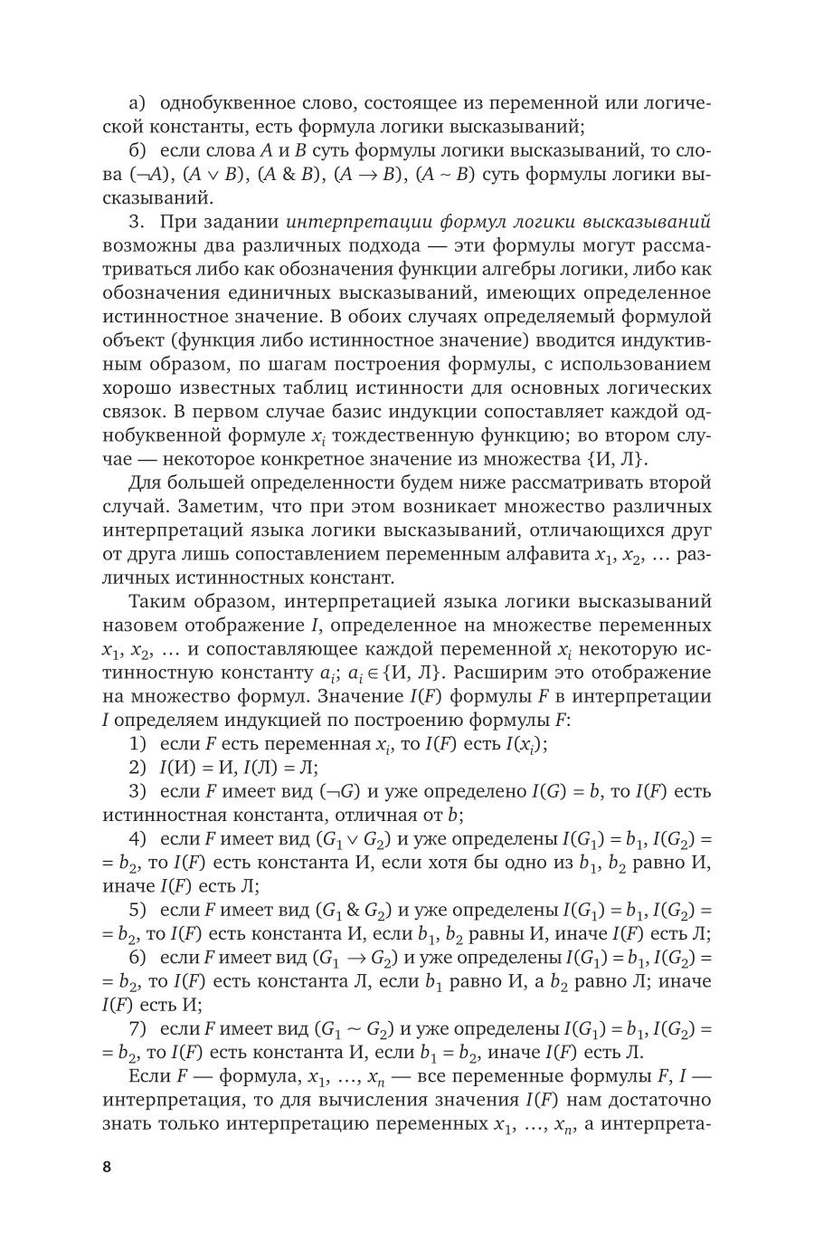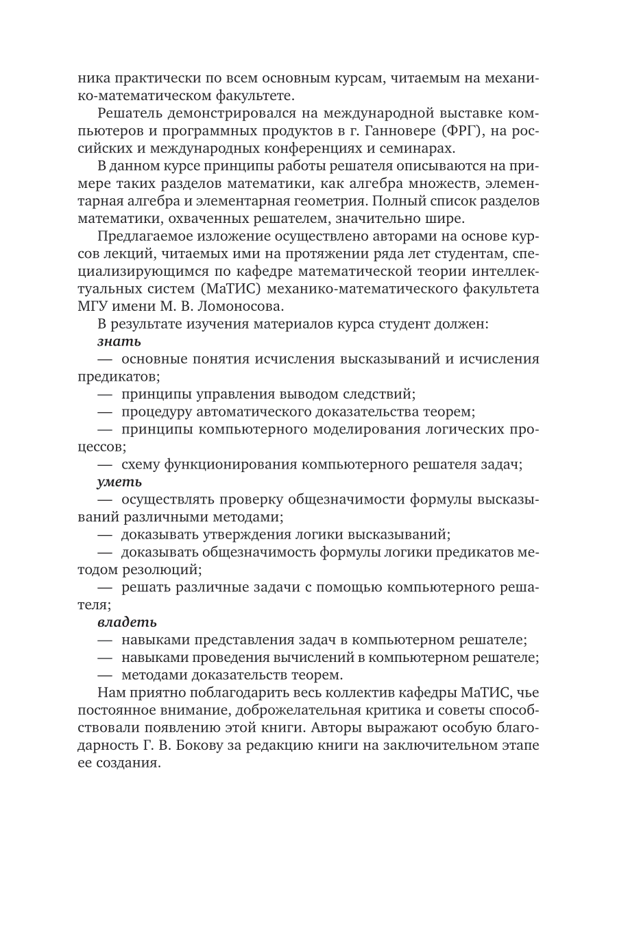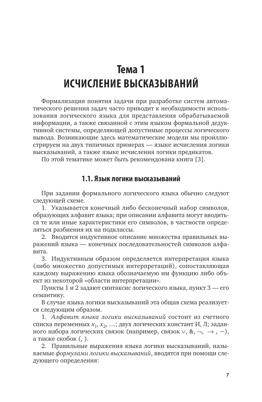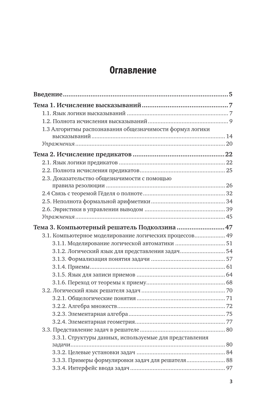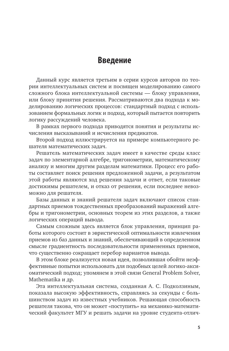 Курс разработан на основе специальных курсов «Компьютерный решатель математических задач», «Интеллектуальные системы», читаемых на кафедре математической теории интеллектуальных систем механико-математического факультета МГУ имени М. В. Ломоносова. Рассматриваются два подхода к моделированию логических процессов: стандартный подход с использованием формальных логик и подход, который пытается повторить логику рассуждений человека. В рамках первого подхода приводятся понятия и результаты исчисления высказываний и исчисления предикатов. Второй подход иллюстрируется на примере компьютерного решателя математических задач. Для студентов, аспирантов и специалистов в области математической кибернетики, дискретной математики и информатики.