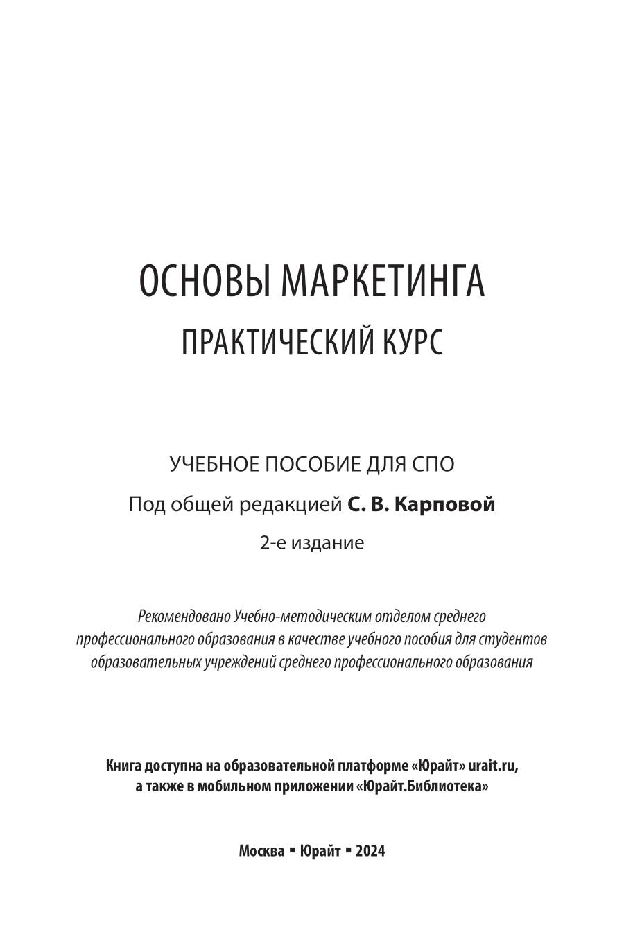Издание подготовлено на основе курса «Маркетинг: теория и практика» под общей редакцией С. В. Карповой. Практический курс представляет собой тематически сгруппированный материал для подготовки к семинарским и практическим занятиям по дисциплине «Маркетинг». Каждая тема в целях более эффективной работы с практическим материалом открывается кратким изложением основных понятий, за которым следуют ситуационные задачи разных видов, в том числе аналитические и расчетные, кейсы, деловые игры. Соответствует актуальным требованиям федерального государственного образовательного стандарта среднего профессионального образования и профессиональным требованиям. Для студентов образовательных учреждений среднего профессионального образования.