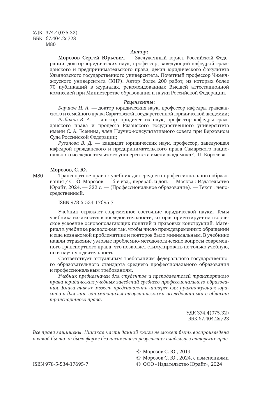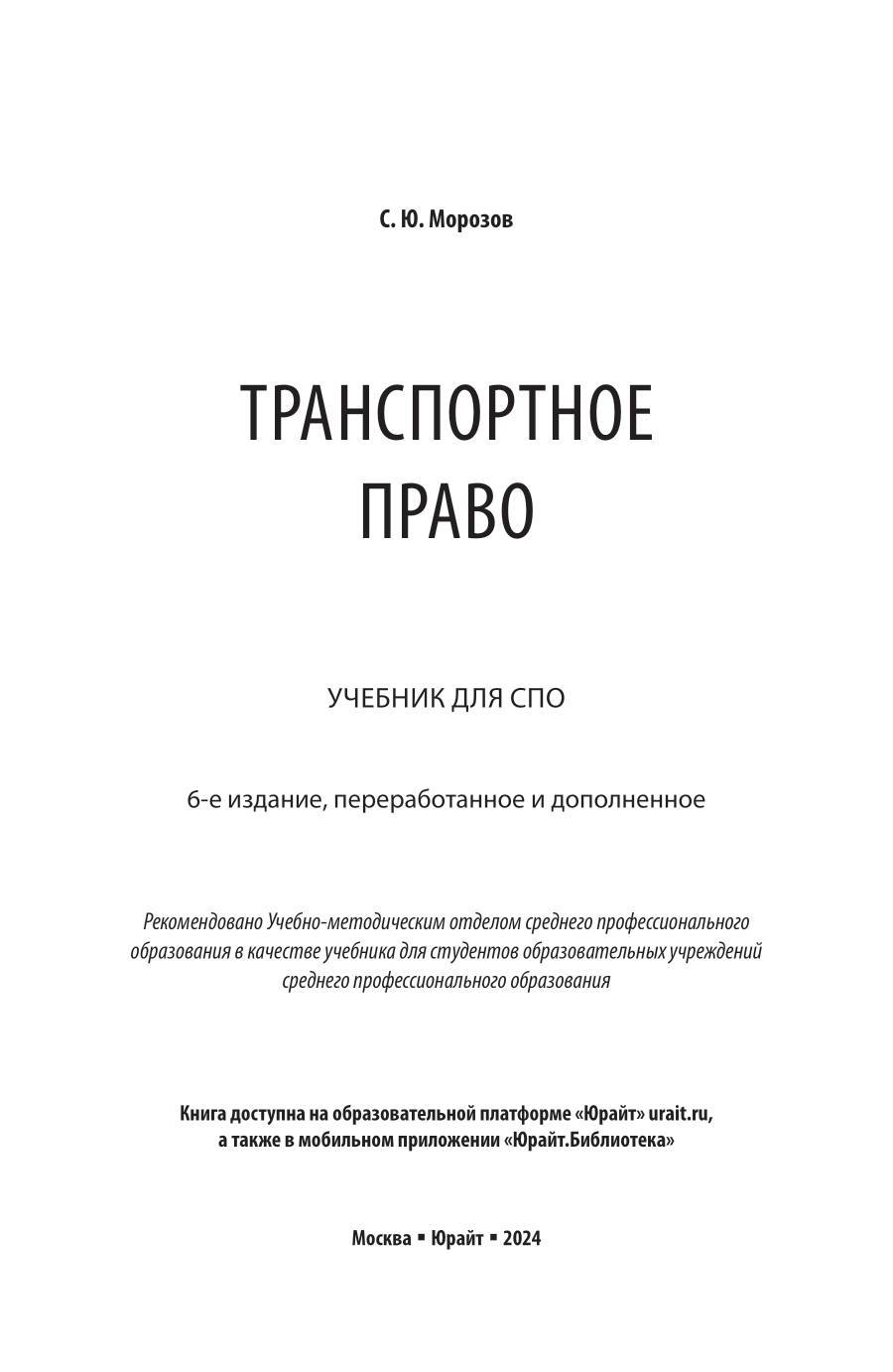 Транспортное право 6-е изд. пер. и доп. Учебник для СПО (Сергей Юрьевич Морозов); ЮРАЙТ, 2024