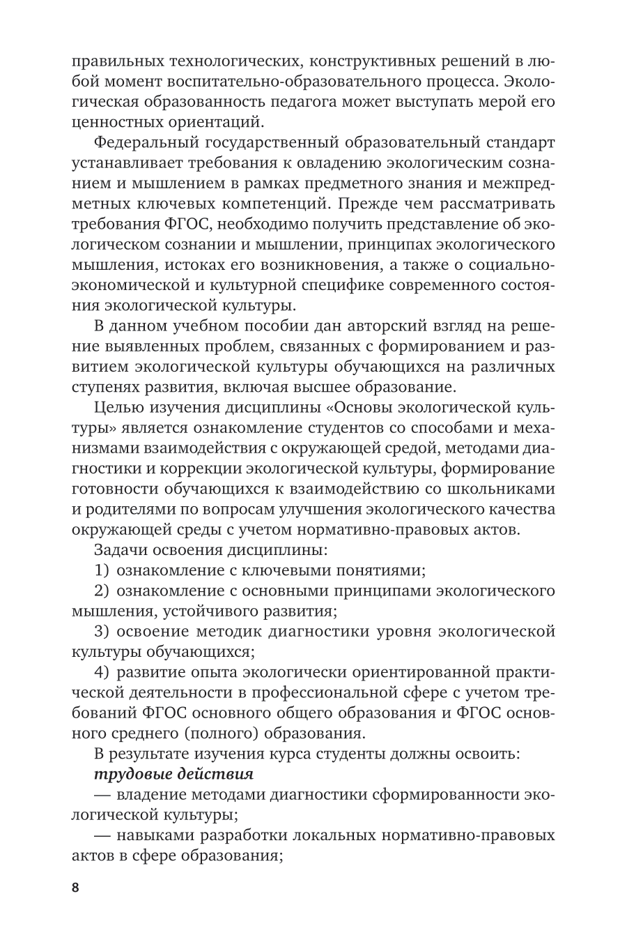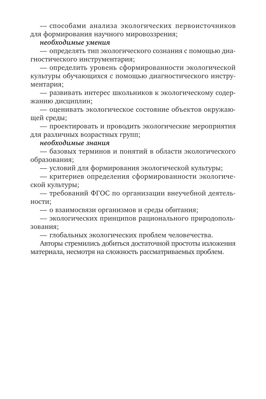 При реализации стандартов в общеобразовательной школе одной из задач является внедрение экологического компонента в учебные предметы на всех уровнях учебного процесса, формирование и развитие экологической культуры обучающихся. Содержание курса соответствует актуальным требованиям профессионального стандарта педагога. В первом разделе даются теоретические понятия и определения, имеющиеся в научной литературе, характеристики особенностей экологического сознания и мышления, технологии и методы формирования экологической культуры в условиях образовательного учреждения. Во втором разделе представлены темы общей экологии. Соответствует актуальным требованиям Федерального государственного образовательного стандарта высшего образования. Предназначен для студентов педагогических вузов, а также будет полезным для учителей школ и педагогов учреждений дополнительного образования при проведении факультативов и спецкурсов по экологии.