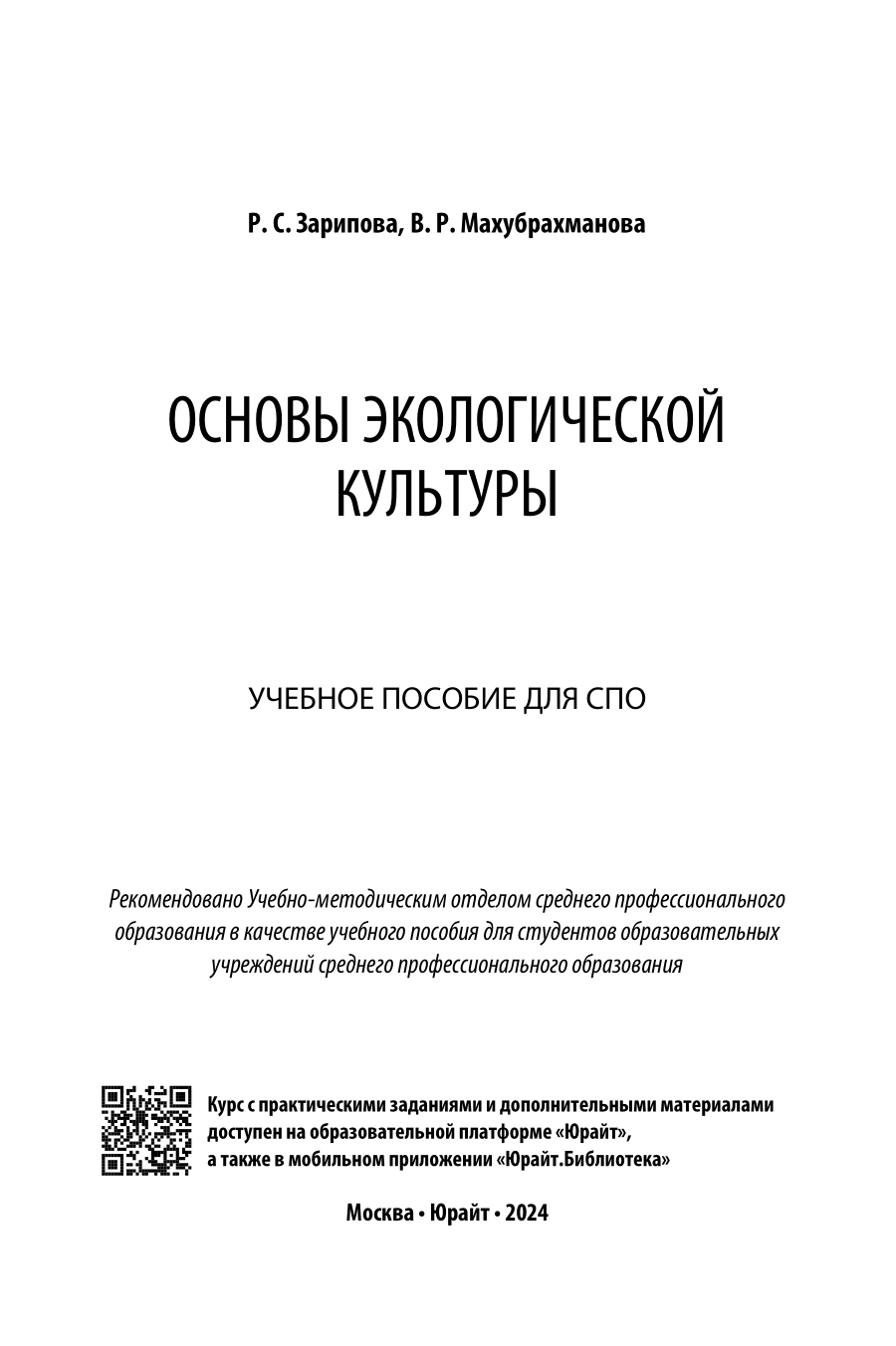 Основы экологической культуры. Учебное пособие для СПО (Рая Салиховна Зарипова); ЮРАЙТ, 2023
