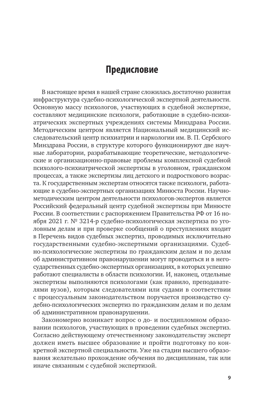 Учебный курс по судебно-психологической экспертизе для психологов содержит материал, соответствующий современным образовательным стандартам и учитывающий действующее законодательство. В курс включены новейшие разработки как в области теоретико-методологических, организационно-правовых и этических основ судебных экспертиз с применением психологических знаний, так и в области производства комплексной психолого-психиатрической экспертизы в уголовном и гражданском процессах. Соответствует актуальным требованиям федерального государственного образовательного стандарта высшего образования. Для студентов, обучающихся по психологическим направлениям и специальностям, аспирантов и преподавателей психологических и юридических вузов, судебно-психологических и судебно-психиатрических экспертов.