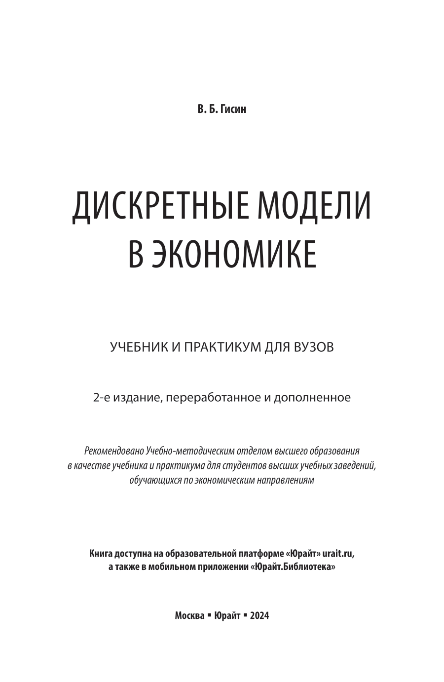 Дискретные модели в экономике 2-е изд. пер. и доп. Учебник и практикум для вузов (Владимир Борисович Гисин); ЮРАЙТ, 2024