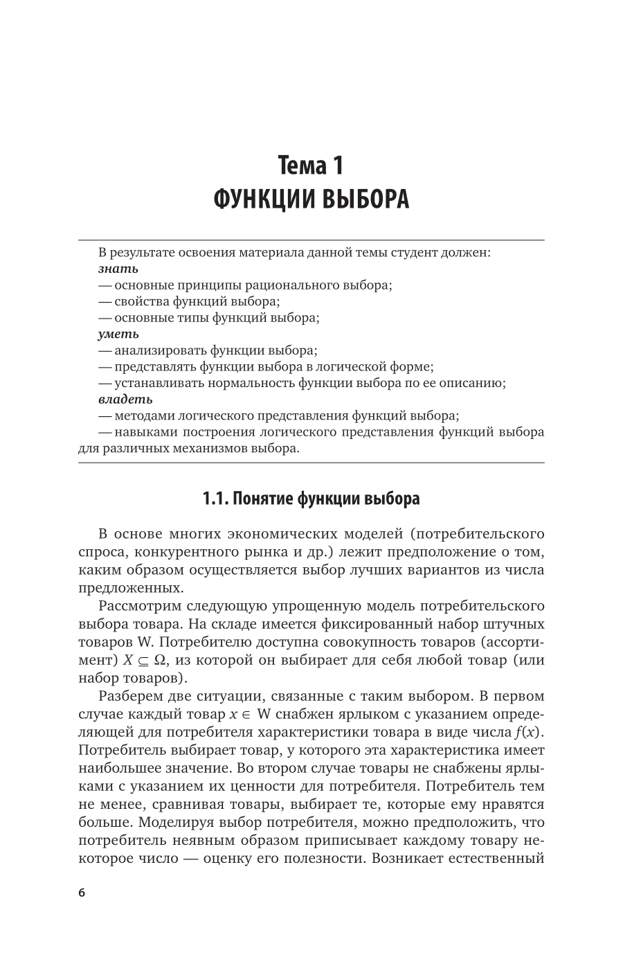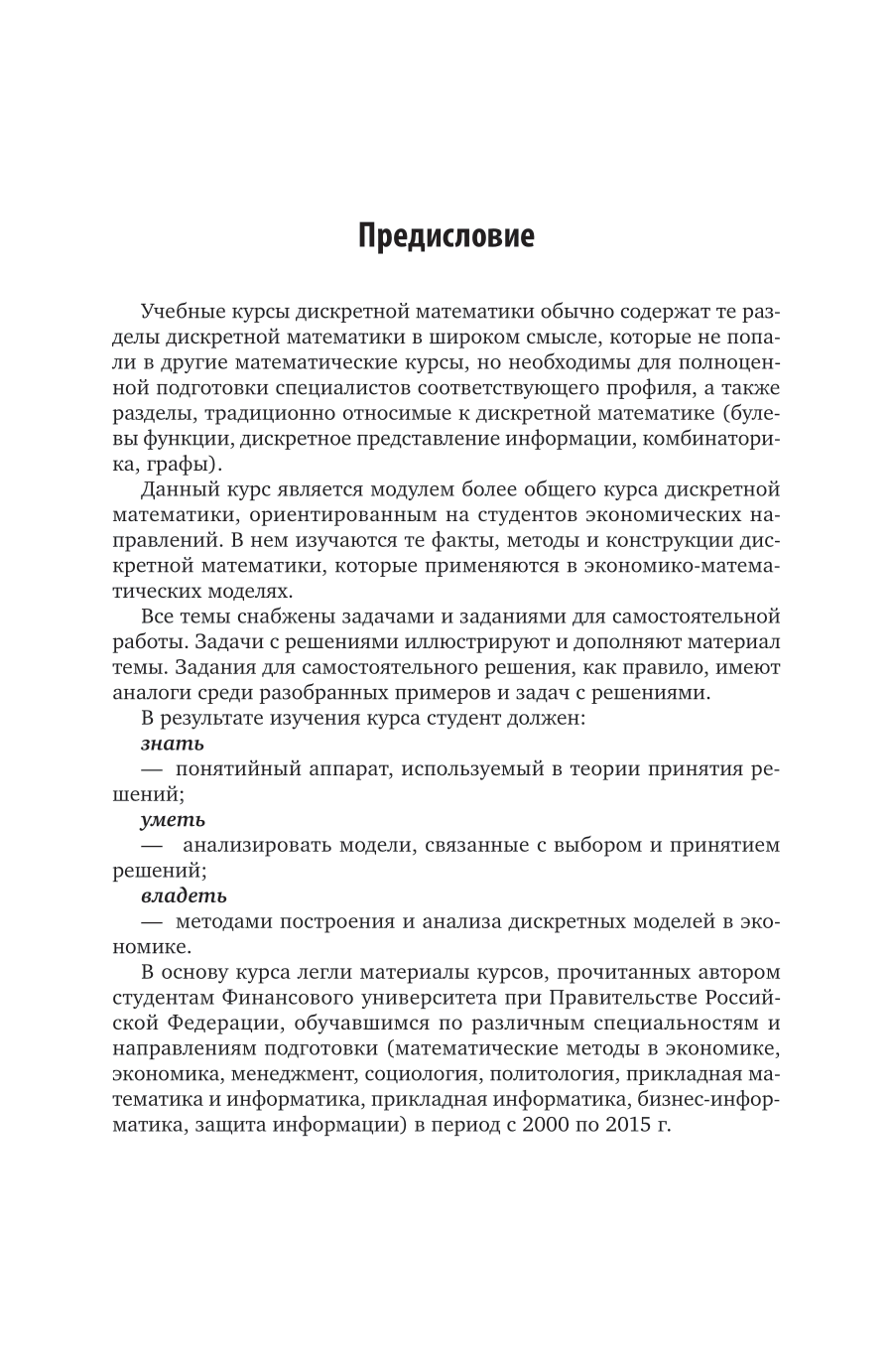 Данный курс является модулем более общего курса дискретной математики, ориентированным на студентов экономических направлений. В нем изучаются те факты, методы и конструкции дискретной математики, которые применяются в экономико-математических моделях: модели принятия решений, функции выбора, биномиальная модель ценообразования активов. Все темы снабжены задачами и заданиями для самостоятельной работы. Задачи с решениями иллюстрируют и дополняют материал темы. Задания для самостоятельного решения, как правило, имеют аналоги среди разобранных примеров и задач с решениями. Для бакалавров и магистров, обучающихся по направлениям экономики и управления.