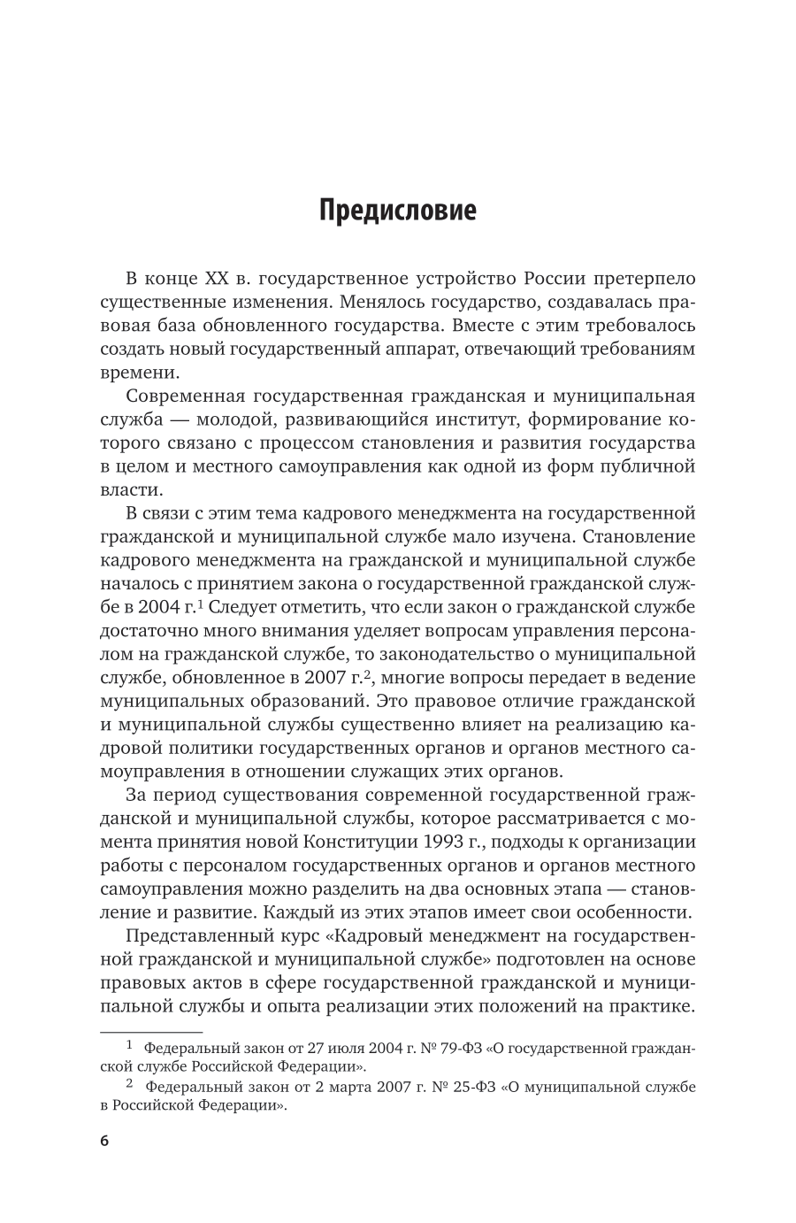 В курсе рассматриваются особенности реализации кадровых процессов в системе государственной гражданской и муниципальной службы. Раскрываются основы формирования структуры государственных органов и органов местного самоуправления, кадровая политика и система управления персоналом на гражданской и муниципальной службе. Описываются основные кадровые технологии, применяемые на гражданской и муниципальной службе: формирование кадрового состава, оценка, мотивация и стимулирование гражданских и муниципальных служащих, формирование позитивного имиджа гражданских и муниципальных служащих. Соответствует актуальным требованиям федерального государственного образовательного стандарта высшего образования. Для студентов высших учебных заведений, обучающихся по социально-экономическим направлениям.