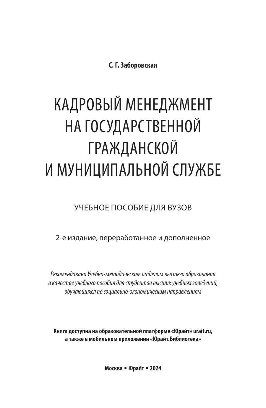 Кадровый менеджмент на государственной гражданской и муниципальной службе 2-е изд. пер. и доп. Учебное пособие для вузов (Светлана Геннадьевна Заборовская); ЮРАЙТ, 2024