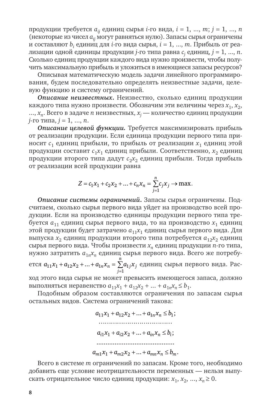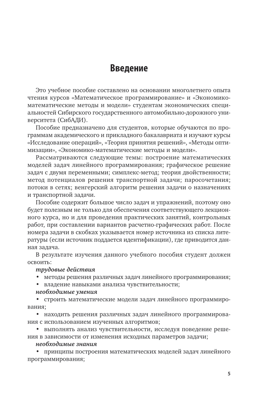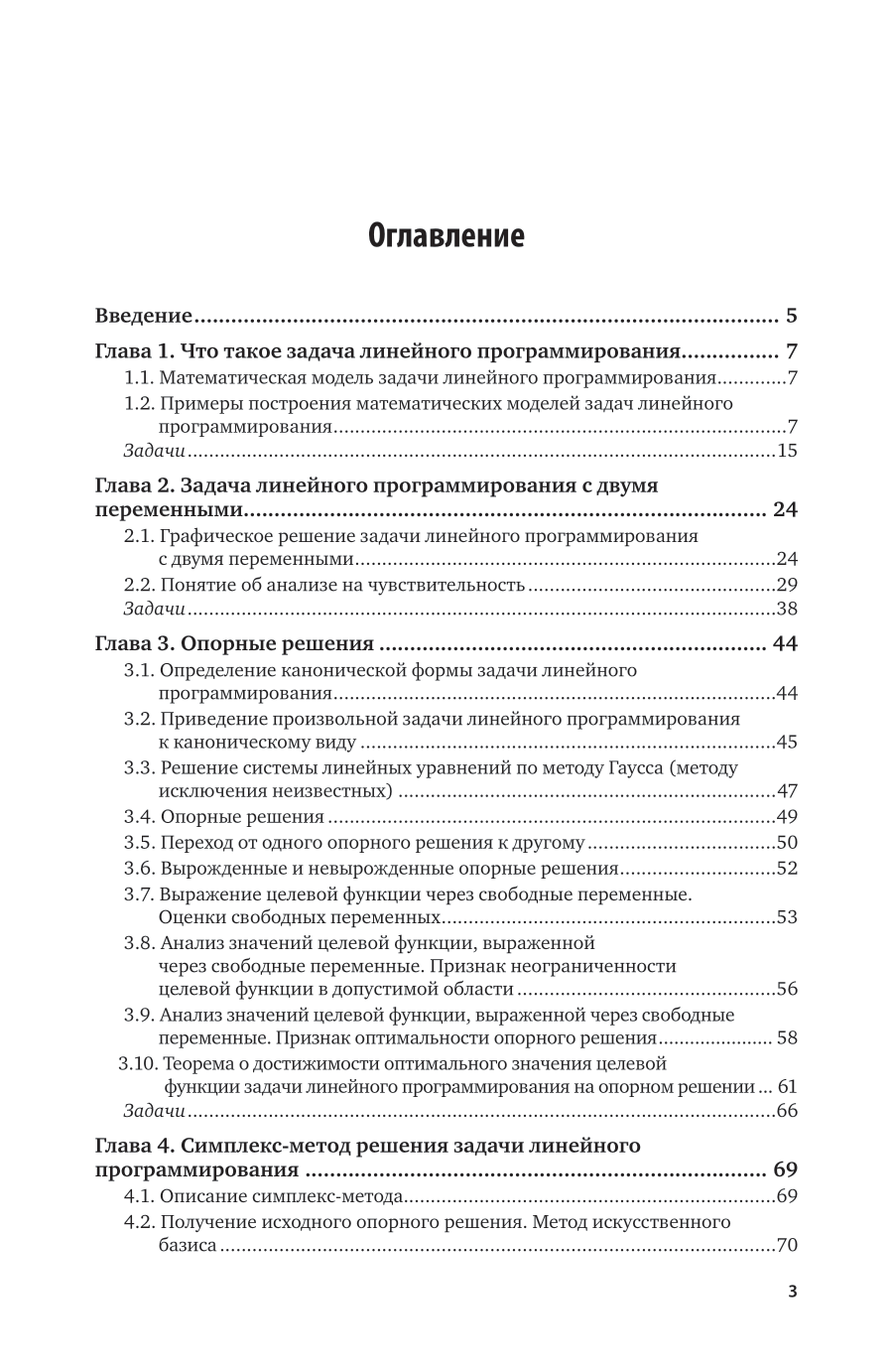 Данное учебное пособие посвящено изучению основ линейного программирования. Изложение теоретического материала сопровождается большим количеством подробно разобранных примеров решения задач, что облегчает усвоение доказательств теорем и принципов работы алгоритмов. В результате изучения данного учебного пособия студенты узнают принципы построения математических моделей задач линейного программирования, обоснование симплекс-метода решения задач линейного программирования, основы теории двойственности, основы теории потоков в сетях, обоснование метода потенциалов и венгерского алгоритма решения транспортной задачи, научатся находить решения различных задач линейного программирования с использованием изученных алгоритмов, выполнять анализ чувствительности, исследуя поведение решения в зависимости от изменения исходных параметров задачи.