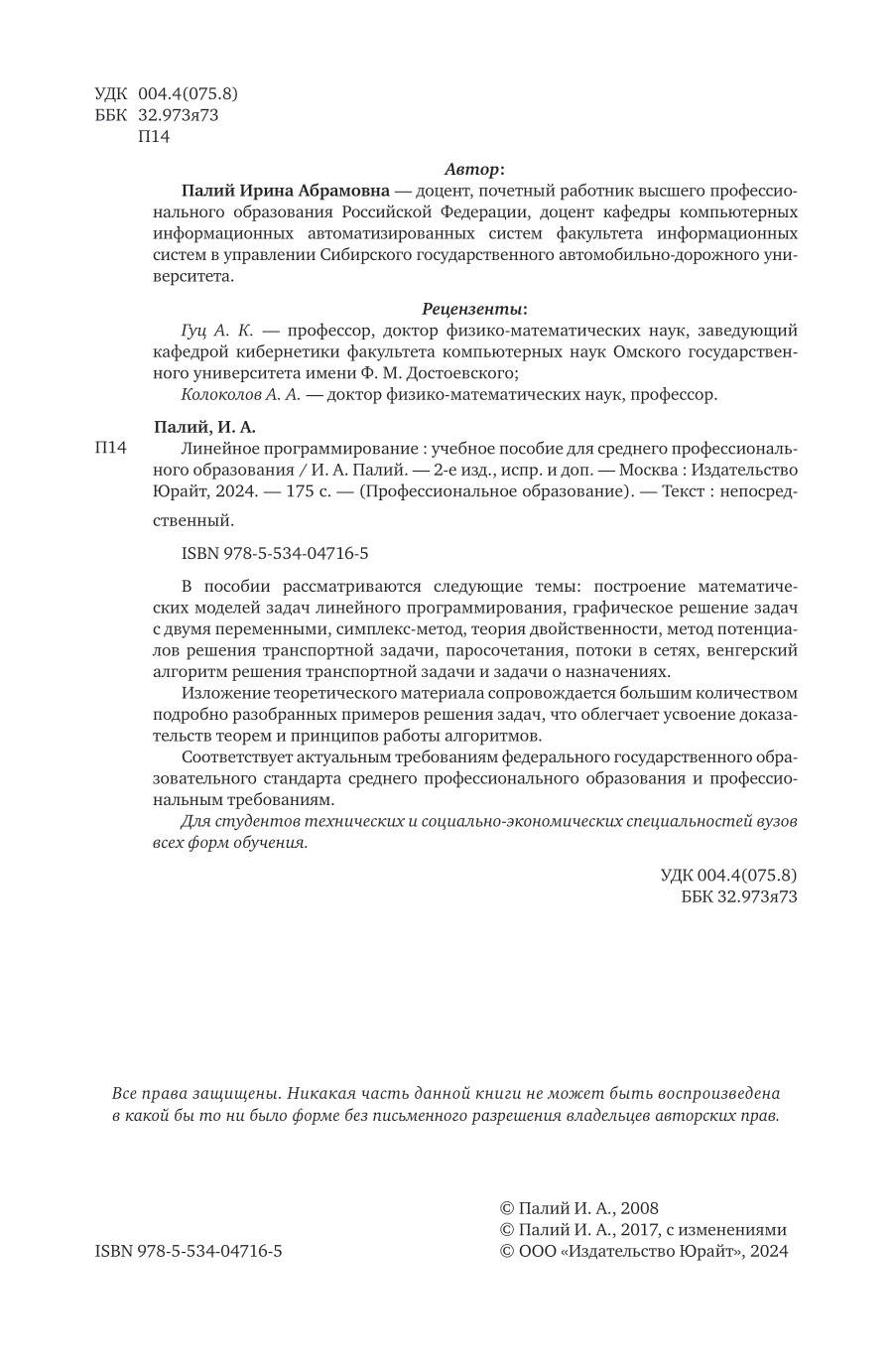 Сервис сравнения цен СкидкаГИД предлагает сравнить цены на товар «Книга: Линейное программирование 2-е изд. испр. и доп. Учебное пособие для СПО (Ирина Абрамовна Палий); ЮРАЙТ, 2024»