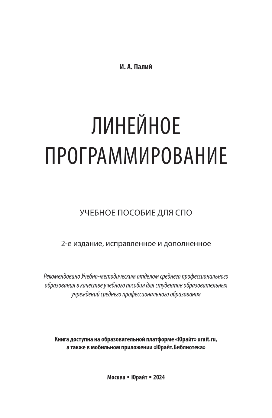 Линейное программирование 2-е изд. испр. и доп. Учебное пособие для СПО (Ирина Абрамовна Палий); ЮРАЙТ, 2024