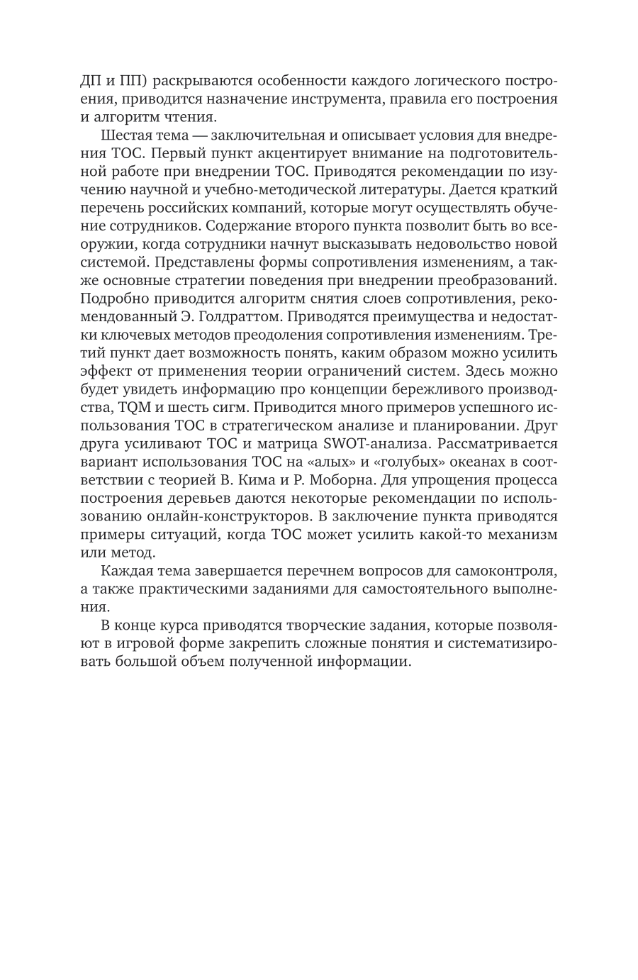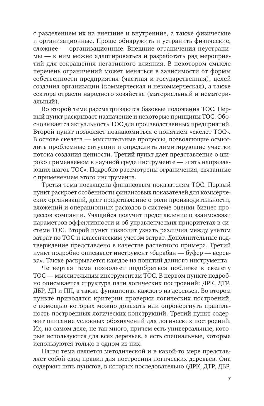 Настоящий курс посвящен теории ограничений систем, утверждающей, что все в мире взаимосвязано и что с помощью логического мышления можно добиться значительного роста производительности практический в любой сфере. В курсе описаны основные положения теории, а также условия и примеры ее функционирования в реальных производственных ситуациях. Подробно рассматриваются логические построения, являющиеся основой теории, дана методика их разработки и применяемые условные обозначения. Отдельная тема посвящена внедрению теории ограничений систем на производстве и возможным ее сочетаниям с другими управленческими концепциями. Соответствует актуальным требованиям федерального государственного образовательного стандарта высшего образования. Для студентов высших учебных заведений, обучающихся по экономическим направлениям.