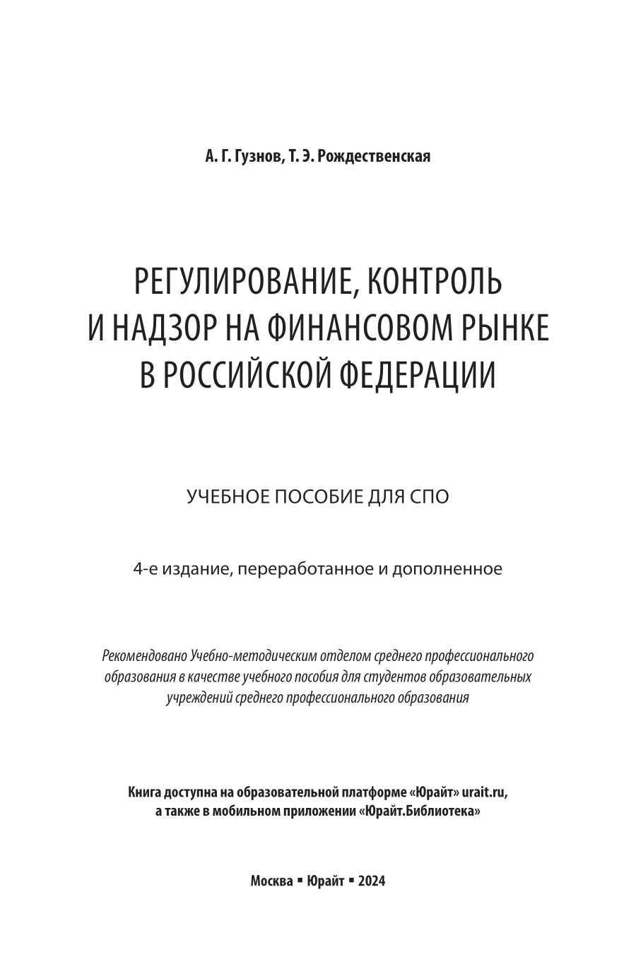 Регулирование контроль и надзор на финансовом рынке в Российской Федерации 4-е изд. пер. и доп. Учебное пособие для СПО (Алексей Геннадьевич Гузнов); ЮРАЙТ, 2024