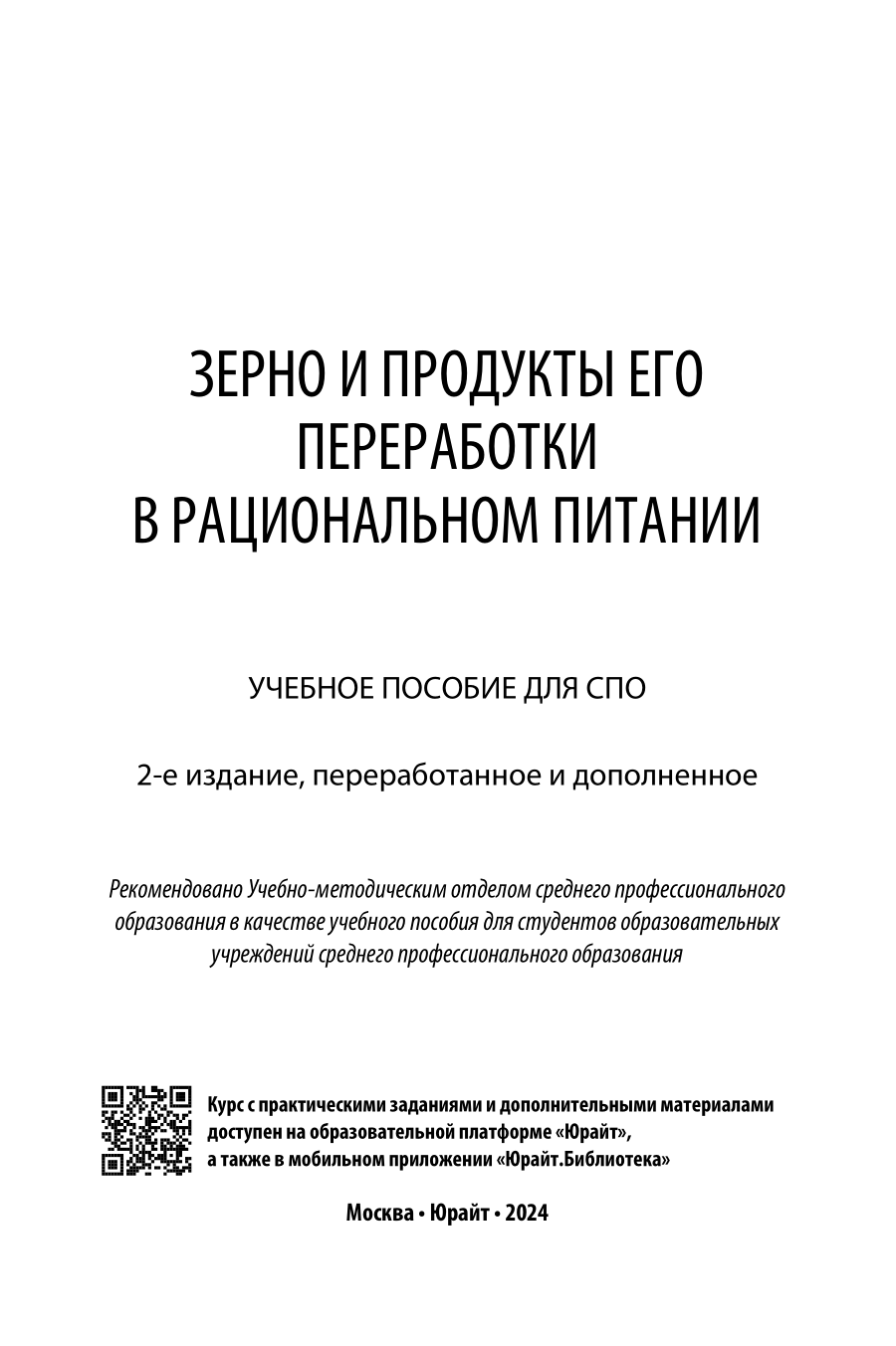 Зерно и продукты его переработки в рациональном питании 2-е изд. пер. и доп. Учебное пособие для СПО (Татьяна Александровна Пасечникова); ЮРАЙТ, 2023
