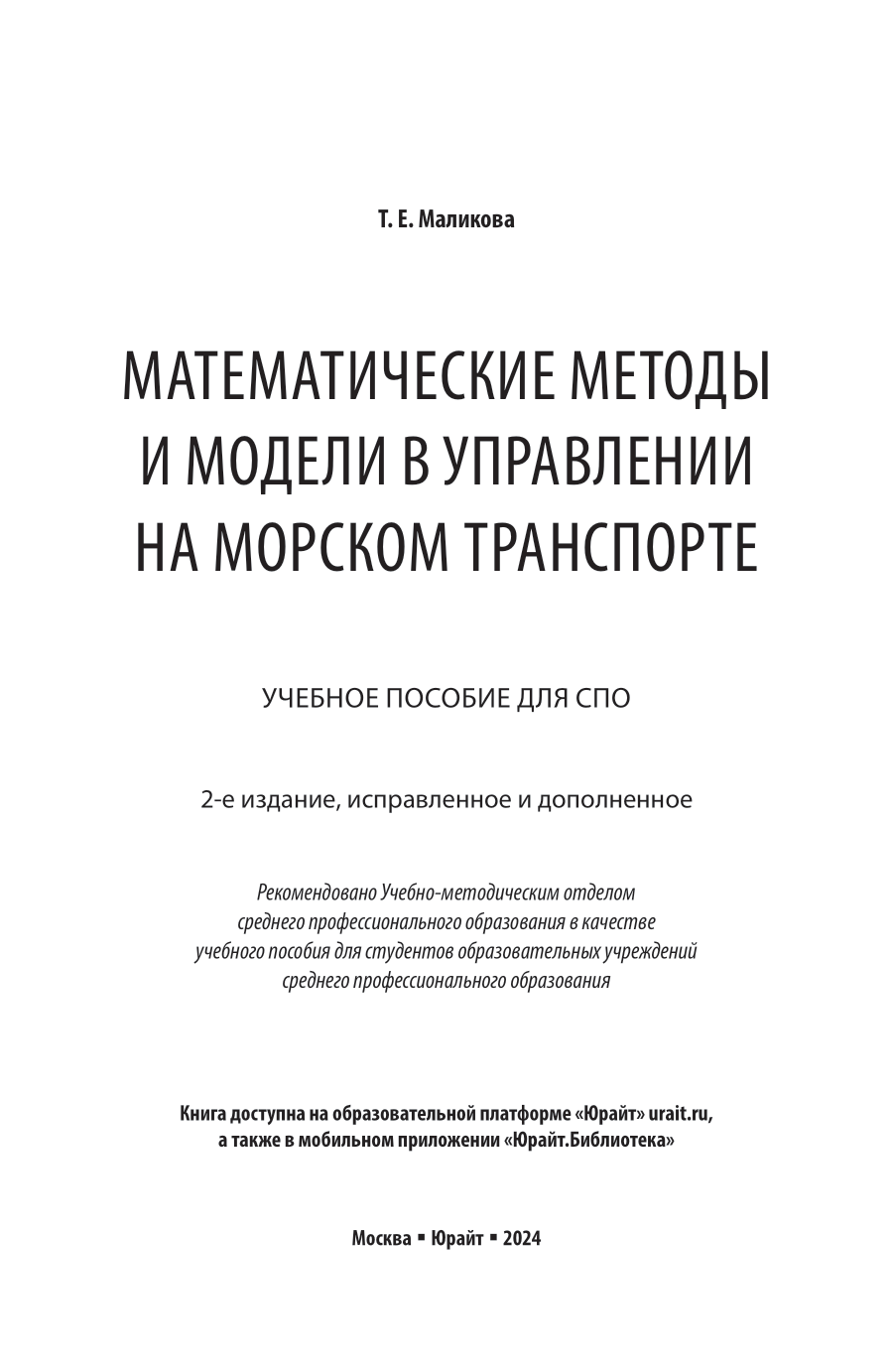 Математические методы и модели в управлении на морском транспорте 2-е изд. испр. и доп. Учебное пособие для СПО (Татьяна Егоровна Маликова); ЮРАЙТ, 2024