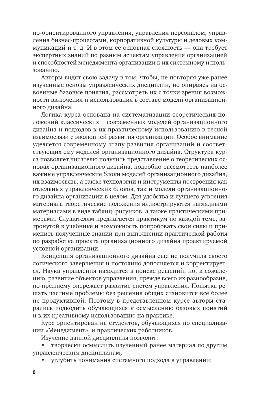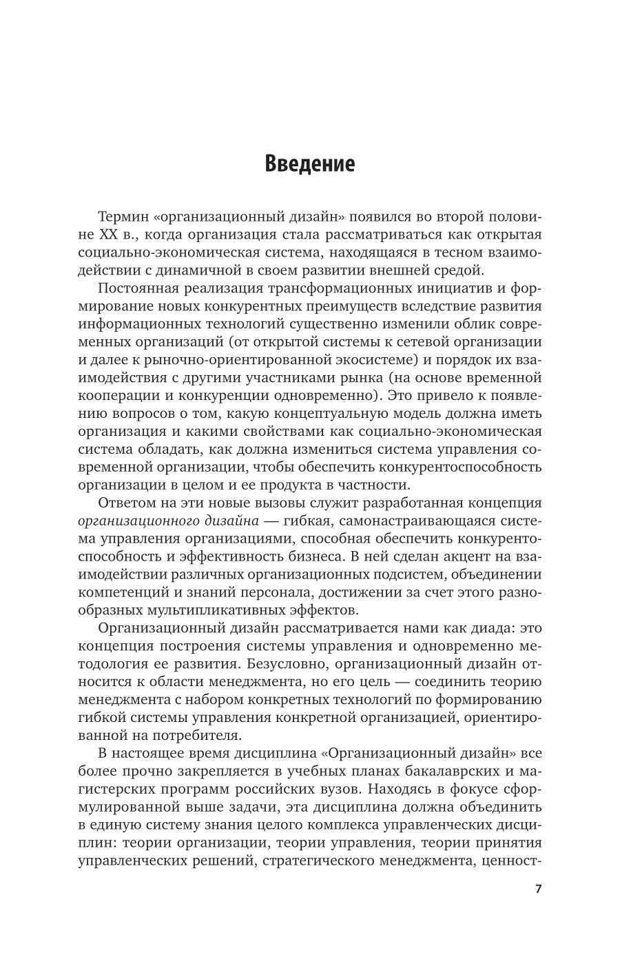 В данном курсе рассматривается концепция организационного дизайна как системы управления организациями, призванной обеспечить конкурентоспособность и эффективность бизнеса в условиях нестабильной и динамично развивающейся внешней среды. Раскрывается содержание классических и современных моделей организационного дизайна и подходов к их практическому использованию в тесной взаимосвязи с эволюцией развития организации. Особое внимание уделяется технологии организационного дизайна. Соответствует актуальным требованиям федерального государственного образовательного стандарта высшего образования. Для студентов, обучающихся по направлениям «Менеджмент» и «Экономика», преподавателей и практических работников.