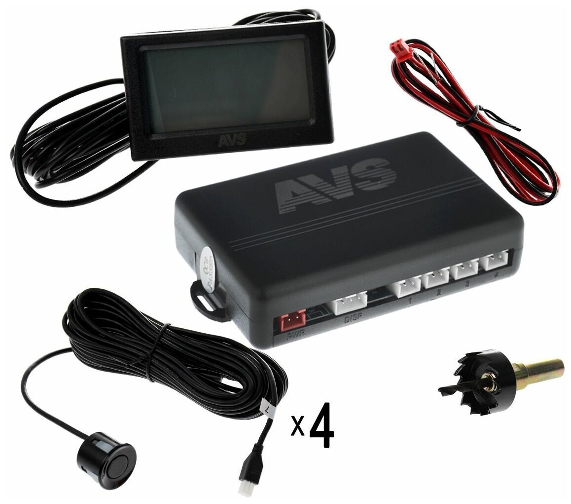 AVS - это парковочный радар, который предназначен для помощи водителю во время парковки автомобиля. Представленный комплект оборудования включает в себя 4 черных датчика для монтажа в задний бампер авто, а также блок управления, дисплей с интегрированным биппером и набор для инсталляции указанных устройств.