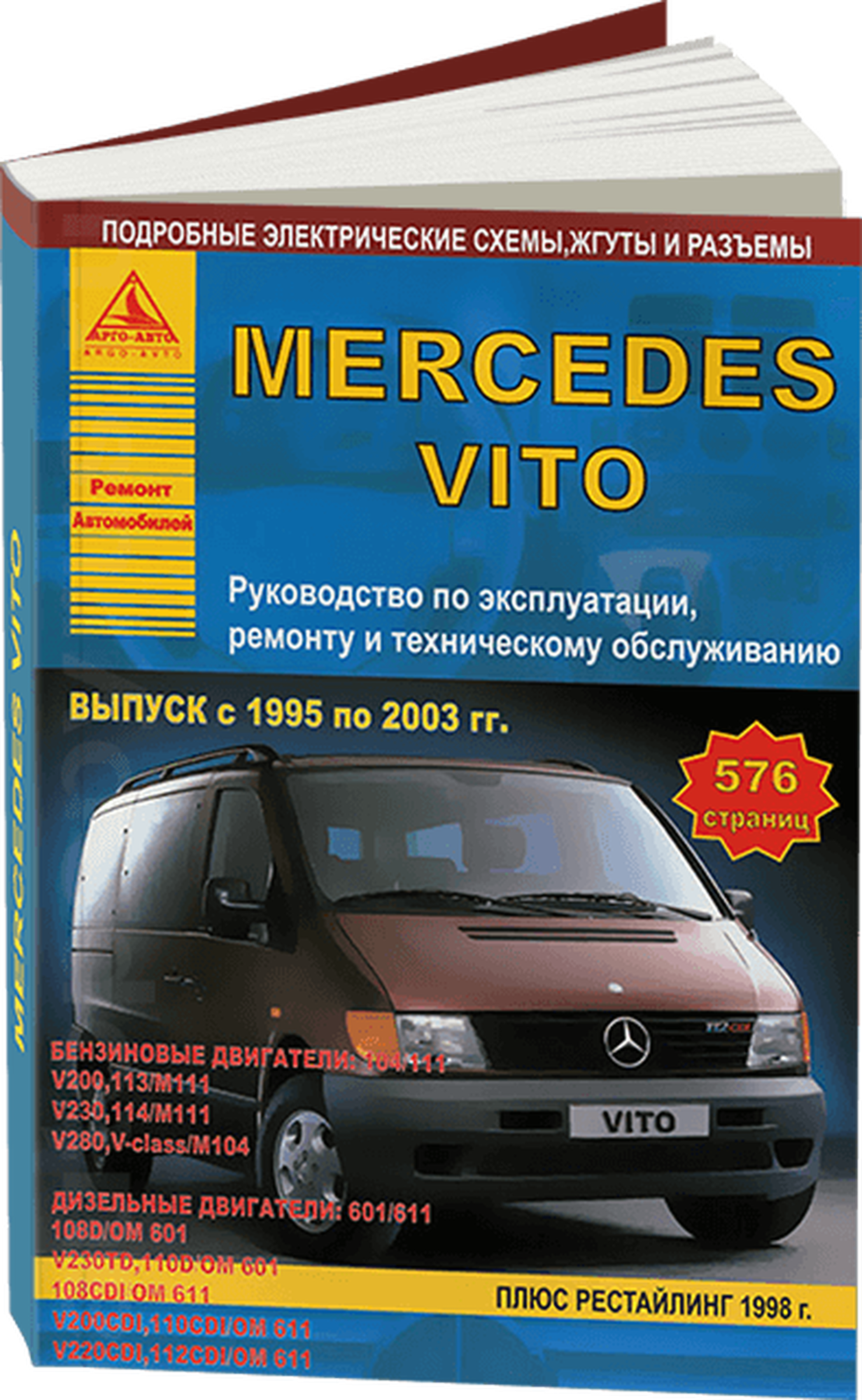 Руководство по ремонту и эксплуатации Mercedes-Benz Vito 1995-2003 годs выпуска, с бензиновыми и дизельными двигателями. Многофункциональный автомобиль Mercedes-Benz Vito имеет современный внешний вид, высокий уровень комфорта и широкие технические возможности. Mercedes-Benz Vito предназначен для широкой аудитории покупателей, которые ценят комфорт, умеют экономить время и, конечно, ценят мобильность. На этом автомобиле вы можете путешествовать вместе с семьей или в компании друзей. Гостеприимный салон, отработанный до мелочей, тканевая или велюрная обивка сидений, просторный автомобиль дарит ощущение безграничного комфорта в путешествии, благодаря современному оборудованию, мягкой подвеске и особой звукоизоляции салона.Практичность и надежность Мерседес-Бенз Вито делает его не только идеальным спутником для любых семейных поездок, но и надежным помощником в проведении бизнес – мероприятий. В этих авто вы сможете увезти все, что вам нужно – вам не придется выбирать между грузовым объемом и числом мест. Mercedes-Benz Vito – это автомобиль, создающий имидж. Задуманный как «дом на колесах», он превращает даже самую короткую поездку в комфортное путешествие. И очень не хотелось бы, чтобы именно на отдыхе случилась какая-нибудь поломка, ведь даже маленькая неисправность способна испортить вам настроение.Но, если вы обладаете руководство по ремонту и эксплуатации Mercedes-Benz Vito 1995-2003 годs выпуска, с бензиновыми и дизельными двигателями, вам не страшны никакие поломки и сбои в работе своего любимого автомобиля. Читая и выполняя все инструкции, указанные в данном пособии, ваше авто никогда не подведёт вас в неподходящий момент.На страницах этого руководства вы сможете ознакомиться с устройством автомобиля, узнать, как действовать в чрезвычайных ситуациях и как правильно определять неисправности, прочитаете полное руководство по эксплуатации автомобиля и основные действия по уходу за ним. В отдельных главах указаны предостережения и правила техники безопасности при выполнении работ на автомобиле, а также основные инструменты, измерительные приборы и методы работы с ними.Далее подробно описаны: механическая часть двигателя; система охлаждения; система смазки; система управления двигателем; система впуска и выпуска; электрооборудование двигателя; сцепление; коробка передач; подвеска; тормозная система; рулевое управление; кузов. Материал изложен по главам и сопровождается подробными схемами и рисунками, поэтому, даже не очень опытный автовладелец сможет разобраться в любых технических тонкостях своего любимца.В конце книги выложены электросхемы для автомобилей Mercedes-Benz Vito.Книга предназначено для владельцев Mercedes-Benz Vito, персонала СТО и ремонтных мастерских.