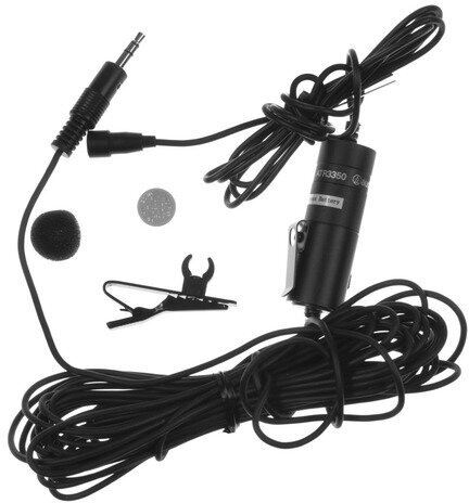 Петличный всенаправленный конденсаторный микрофон для использования в аудио- и видеопроизводстве, при занятиях спортом или танцами. Двойной монофонический штекер типа 1/8” TRS mini-Jack (3,5 мм), длина кабеля составляет 6 метров. В комплекте – клипса для галстука, плоская батарея типа LR44 на 1.5В и ветрозащита.