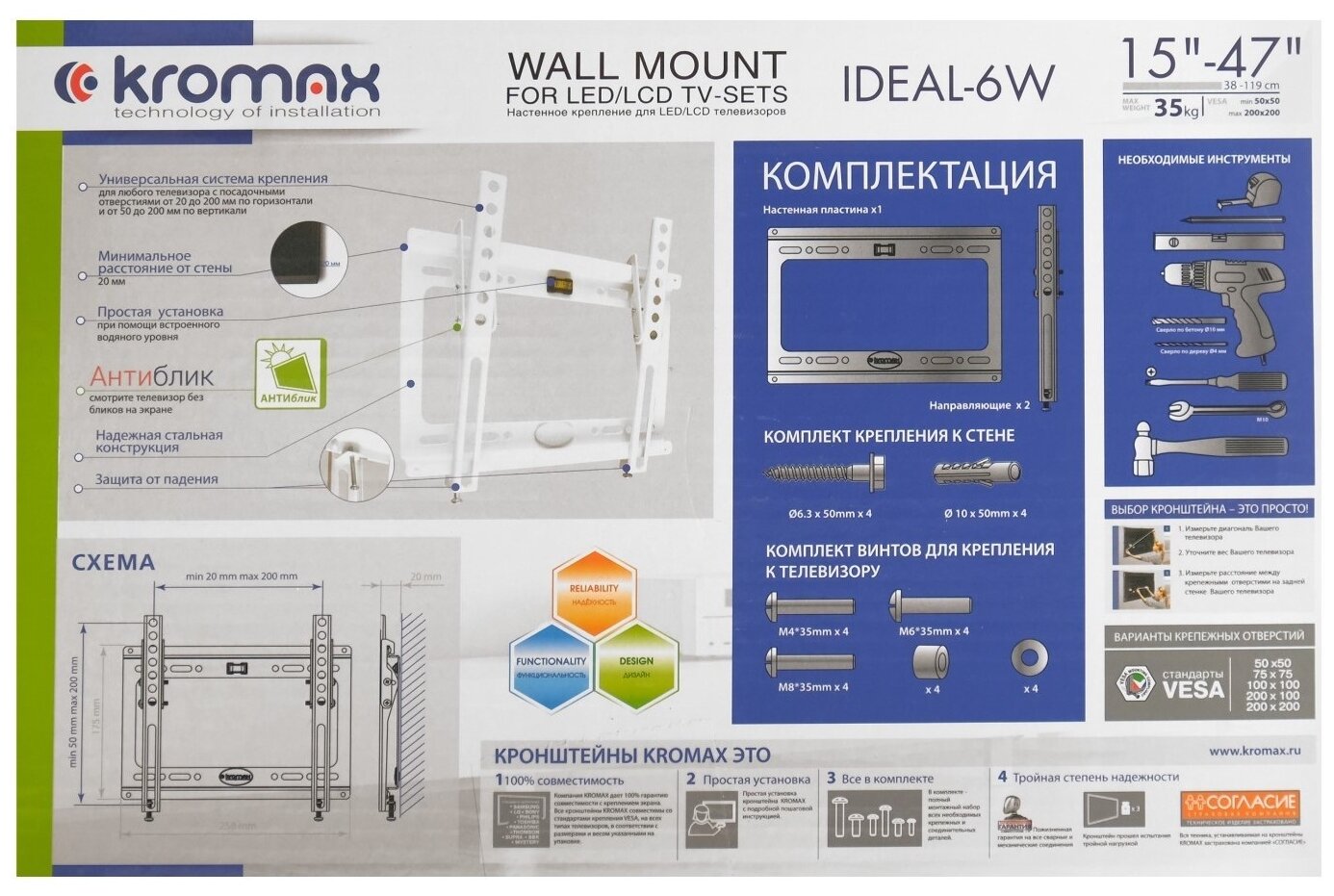 Кронштейн для телевизора Kromax IDEAL-6 черный, рекомендуемая диагональ 15"-47", максимальная нагрузка 35кг, настенный, наклон, угол наклона -0/+8, (26006)