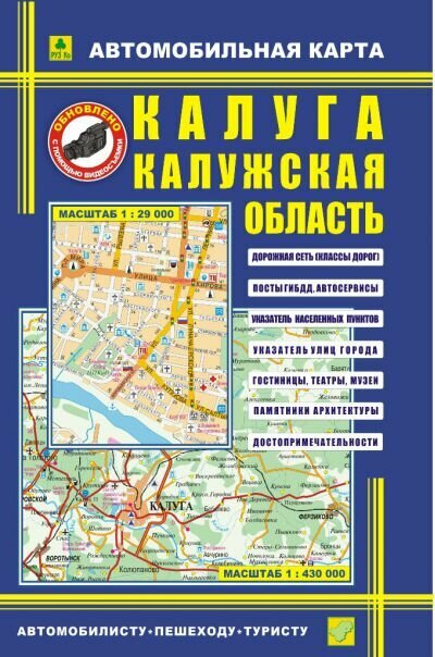 Автокарта складная, масштаб г. Калуга - 1: 29 000, Калужской области - 1: 430 000. Карта содержит: дорожную сеть (классы дорог), километровые знаки, указатели населенных пунктов, указатель улиц города, АЗС, автосервисы, дома отдыха, санатории, памятники архитектуры.